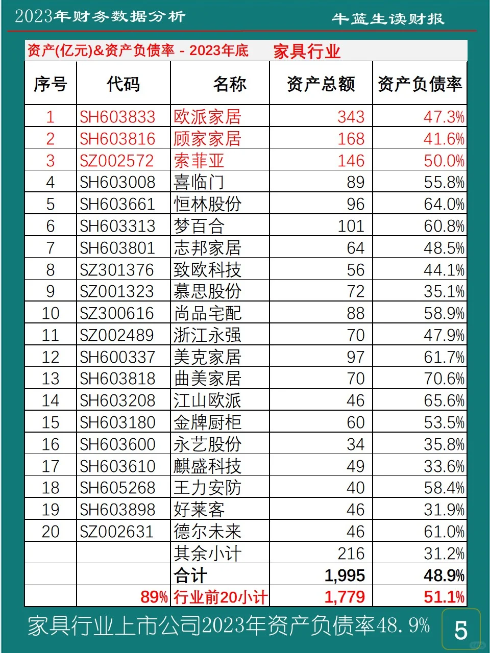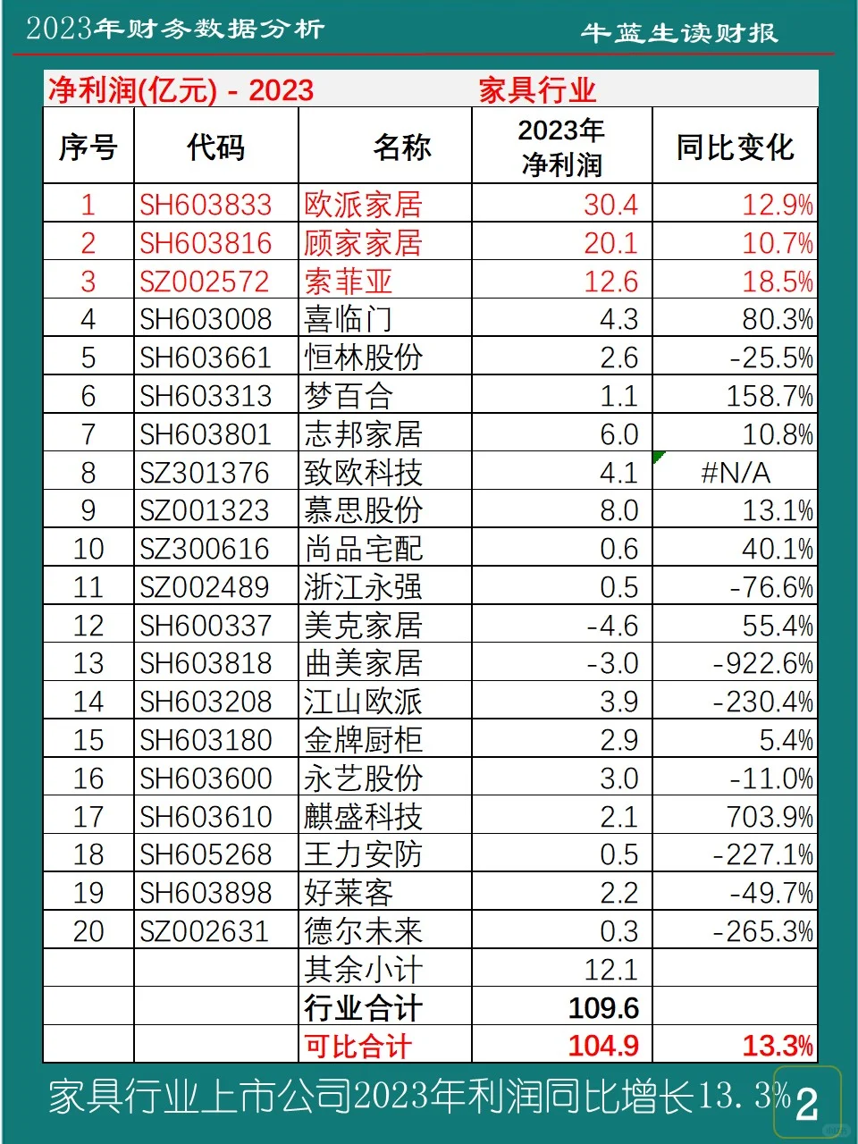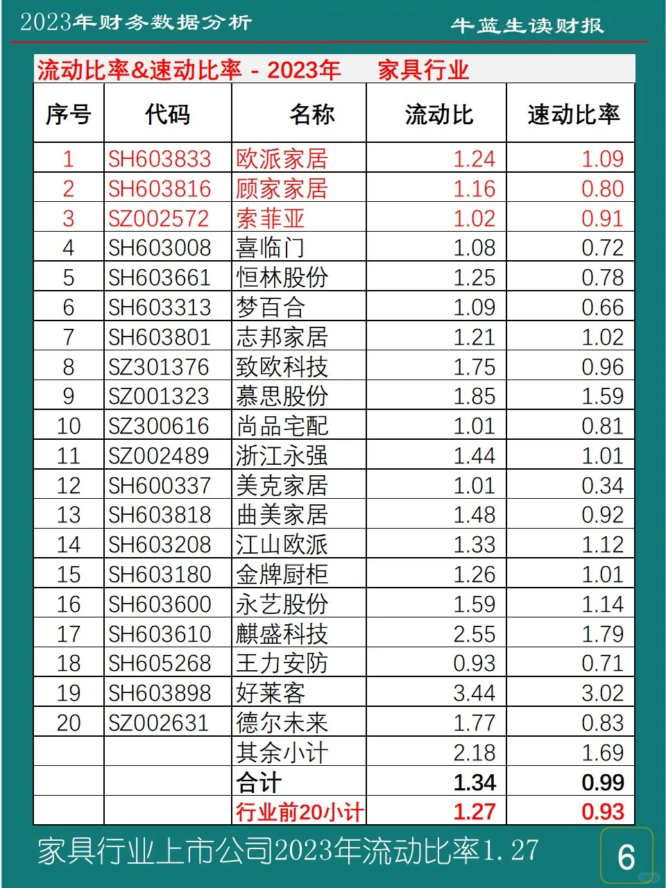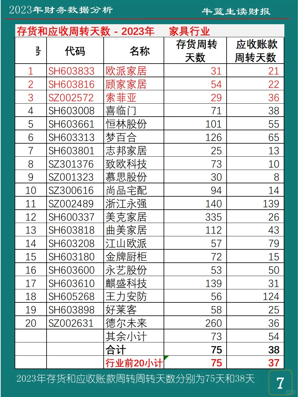 家具行业上市公司2023年财务数据 -营收同比增长1.4% -净利润同比增长13.3% -平均毛利率33.6%;平均ROS 11.8% -员工人数同比略降0.06% -平均资产负债率48.9% -流动比率1.27,速动比率0.93 -存货周转天数75天;应收账款周转天数38天