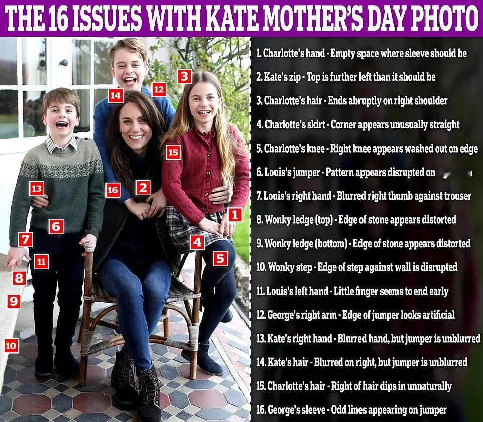 看看凯特王妃的近况细思极恐,所以英国皇室最聪明的媳妇恐怕是梅根。 最近,英国每日邮报刊登了一张庆祝母亲节的照片,其中王妃凯特·米德尔顿和她的孩子们成为了焦点。然而,这张照片的真实性却引发了广泛的争议。热心人士和批评家们仔细审视后,指出了不少于16处可能的“Photoshop问题”,让人们对这张照片的真实性产生了质疑。 在这张照片中,夏洛特公主穿着一件粉色连衣裙,裙摆飘逸。然而,仔细观察她的袖子,可以发现本应连续的位置出现了一个明显的“空白”,这让人猜测是否是在编辑过程中出现了疏忽。凯特·米德尔顿则穿着一件优雅的长裙,然而,她的装扮似乎有些“错位”,拉链部分看起来并不自然,打破了衣服设计的流畅感。 此外,路易斯王子身穿一件毛衣,上面的图案似乎并不规则,甚至可能经过了修改。这一异常现象进一步加深了人们对照片数字修图程度的猜测。除了这些明显的问题外,照片中还存在其他更细微的数字操纵迹象,如肤色、光影等的不一致。 整个欧洲媒体居然都把王妃弄丢了,可想而知王室的手段。