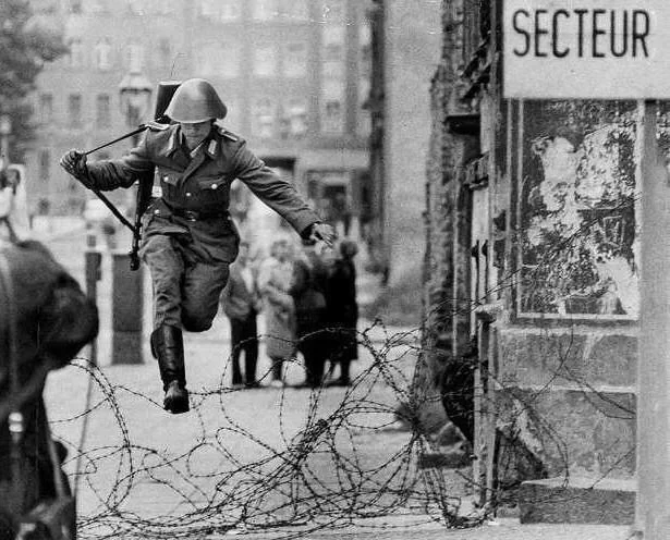 1961年8月15日,当时年仅19岁的康拉德·舒曼(Hans Conrad Schumann)被派驻到正在施工的柏林墙边执勤。那时柏林墙仅仅是一道很矮的铁丝网,在墙的另一侧的摄影师彼得·莱宾看到了拿着PPSh-41冲锋枪,神情十分不安的舒曼。在约1小时后,对面的西德民众向舒曼喊道“过来这边吧,过来这边”。同一天的下午4点,摄影师莱宾捕捉到舒曼丢掉香烟、背着枪跳过柏林墙的镜头。这张照片《跃向自由》同年被授予OverseasPress Club奖,同时也成为了柏林墙、甚至是冷战最著名的照片之一。
