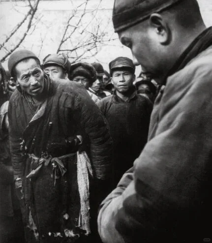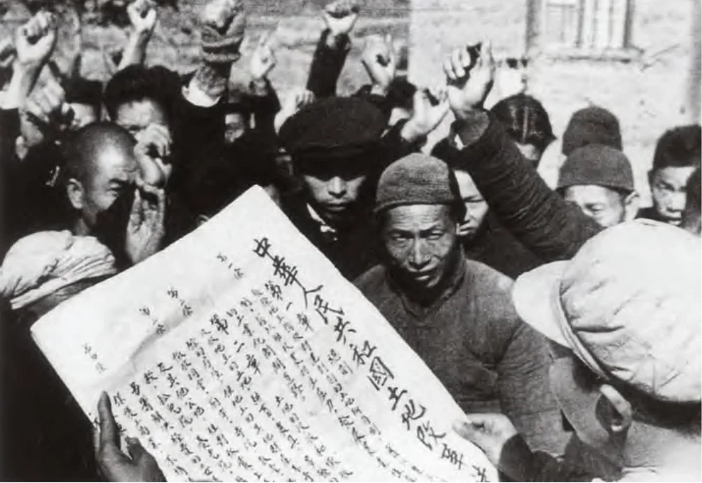 图1图2:1951年,土改运动期间,青海省民和县一位农民在群众大会上控诉地主 图3:1950年北京郊区完成了土地改革。这是翻身农民开会斗争恶霸地主 图4:20世纪50年代初,干部在给人民群众宣读《土地改革法》