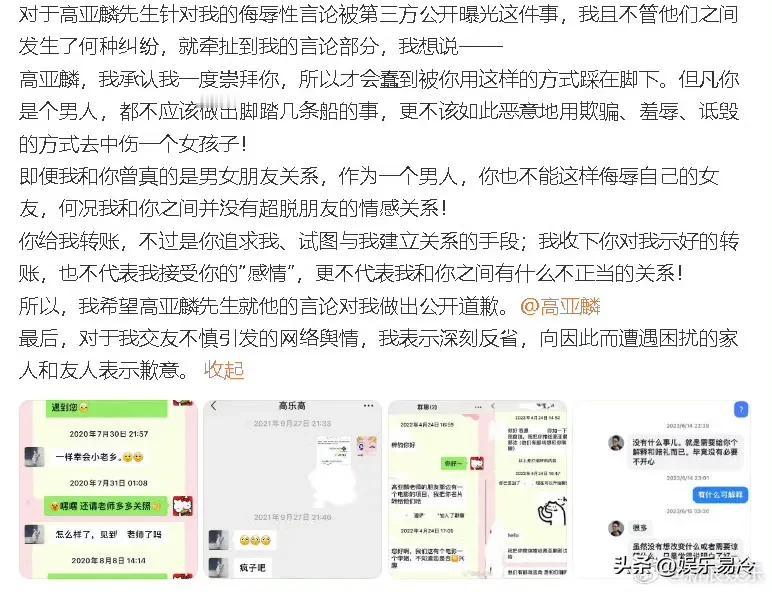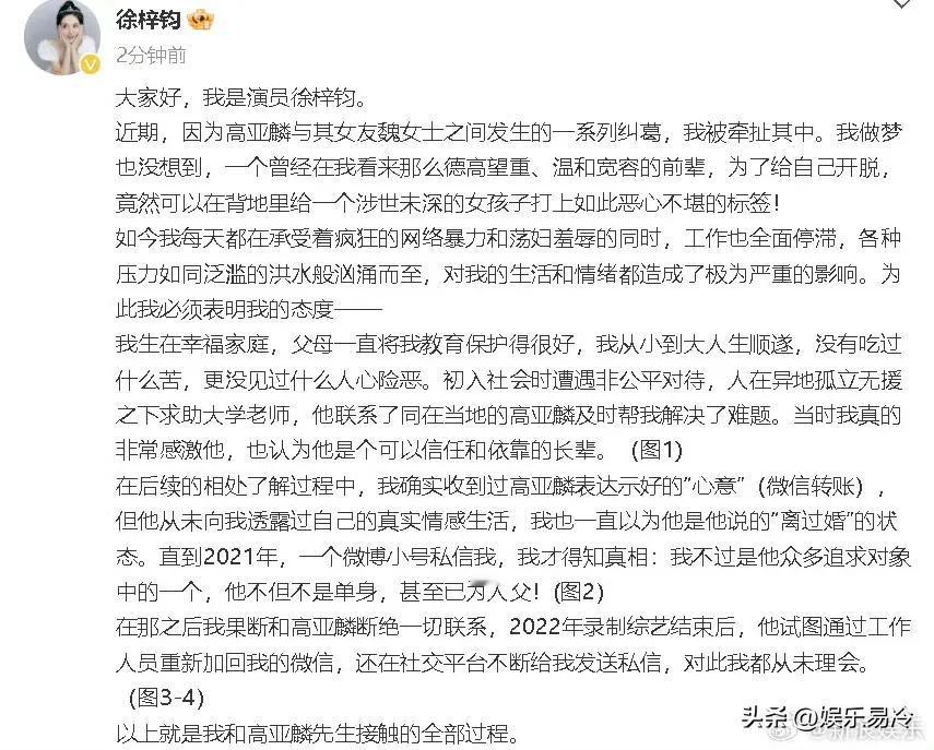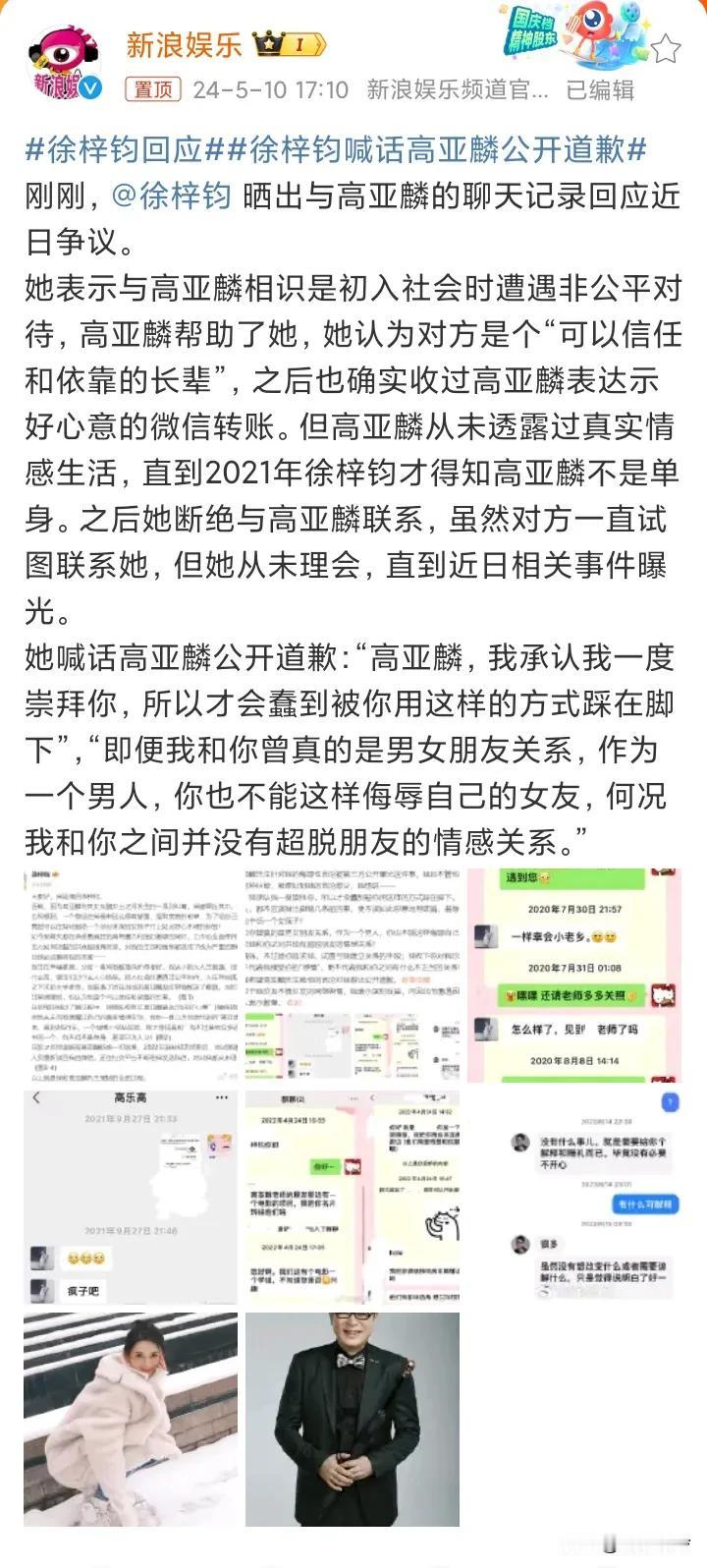 “收下转账不代表我接受你的感情”,我收钱≠我同意,徐梓钧创造了新的不等式,这逻辑无敌了。 不管什么情况,任何女孩子,被自己曾经信赖过的前辈形容为🐔,肯定是非常愤怒的,要求对方公开道歉也合情合理。 但是,你不接受人家的感情,却又接受了人家的钱财,这不是变相承认了自己是身体交换吗?这不等于承认高亚麟说得是对的吗?