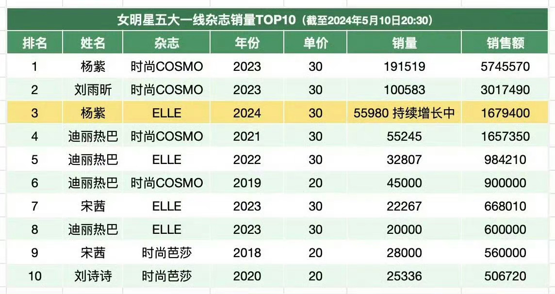 女明星五大一线杂志销量:杨紫前三有二。我圈富婆米好多啊,好爱。