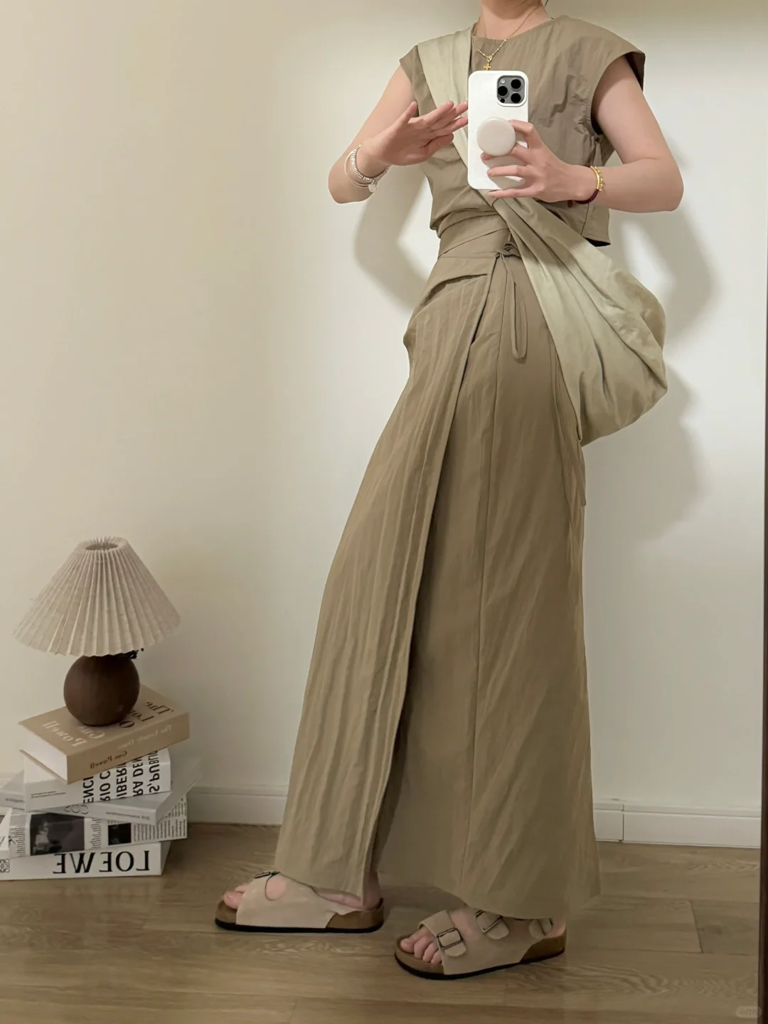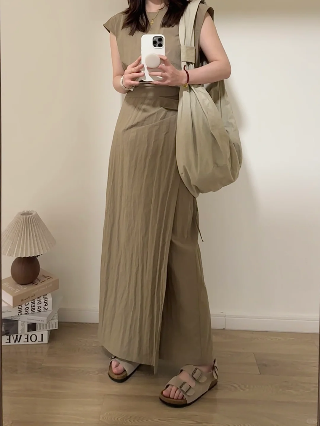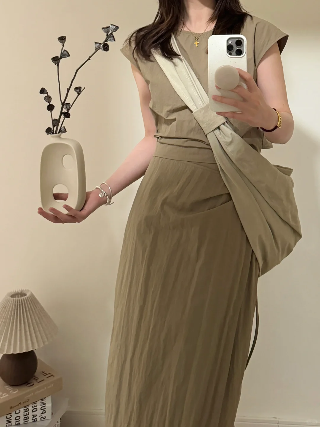 慵懒随性|卡其无袖上衣+卡其半裙+斜挎帆包