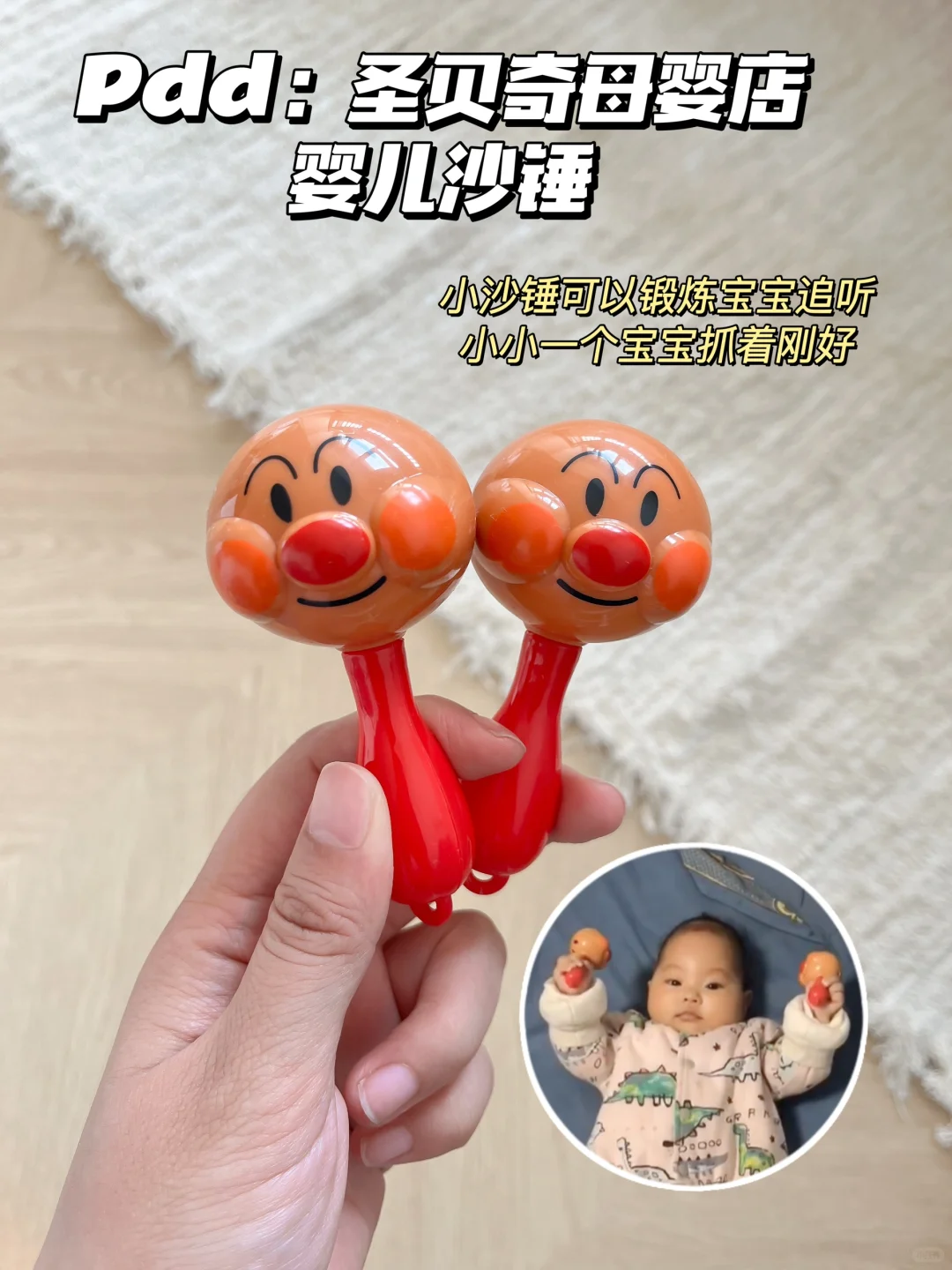 沙锤可以让宝宝练习追听,小小一个宝宝抓着刚刚好