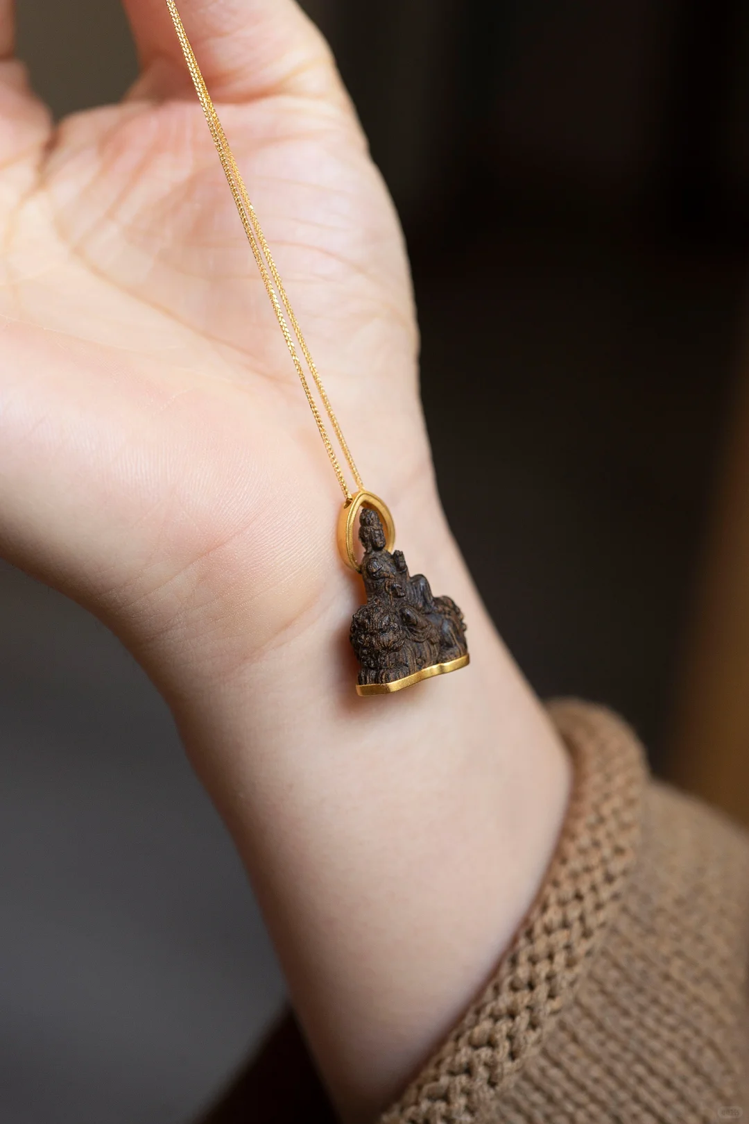属相"兔"的守护神【文殊菩萨】随身佛油脂爆满,生闻香气醇厚,花香,果香,层次丰富。 18k金镶嵌文莱黑棋沉水,品相漂亮,精雕细琢佳作