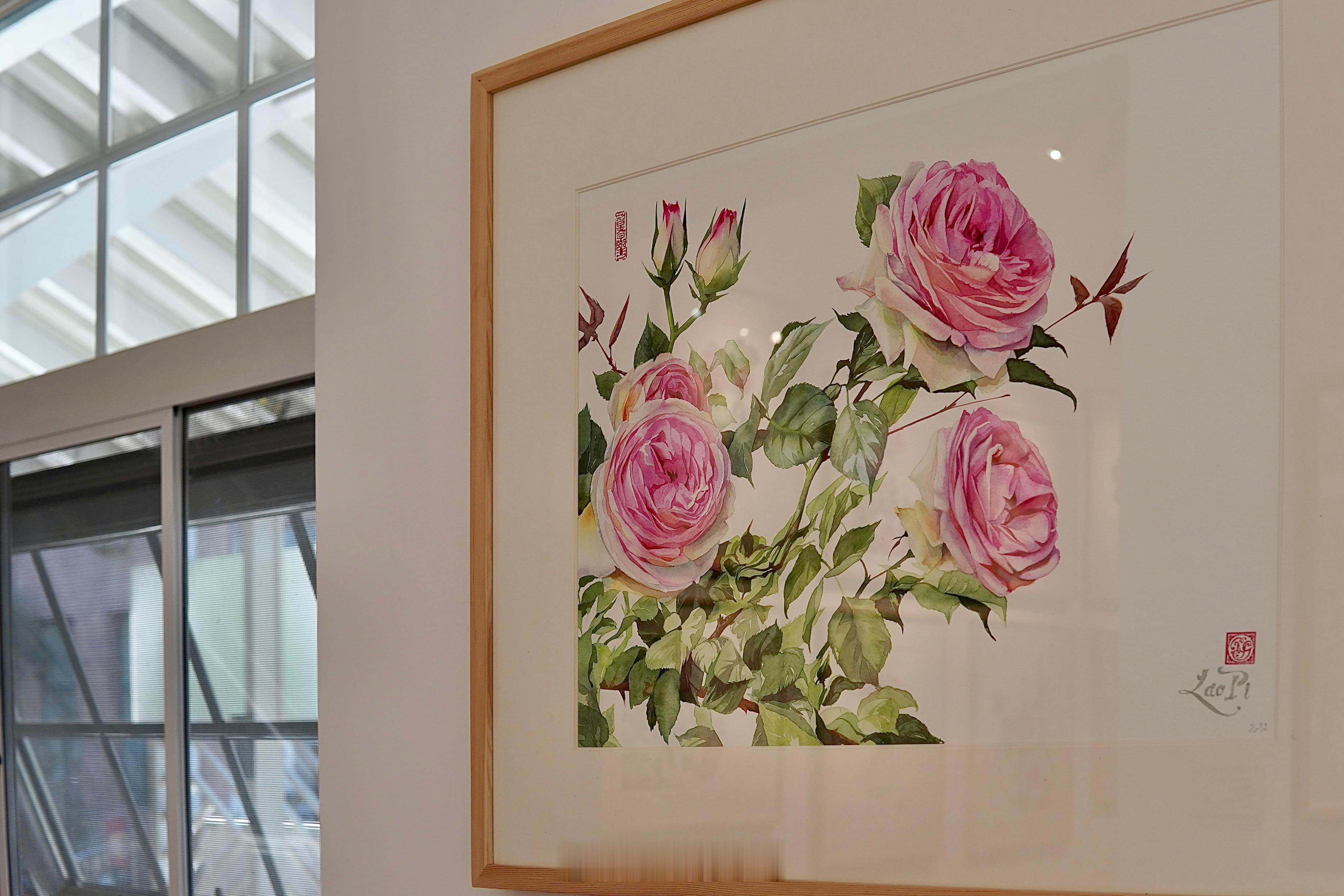 一家咖啡馆艺术画廊,马上展出的水彩画都是月季花。这么细腻温柔的画儿,作者是一位1960年生人的爷爷。