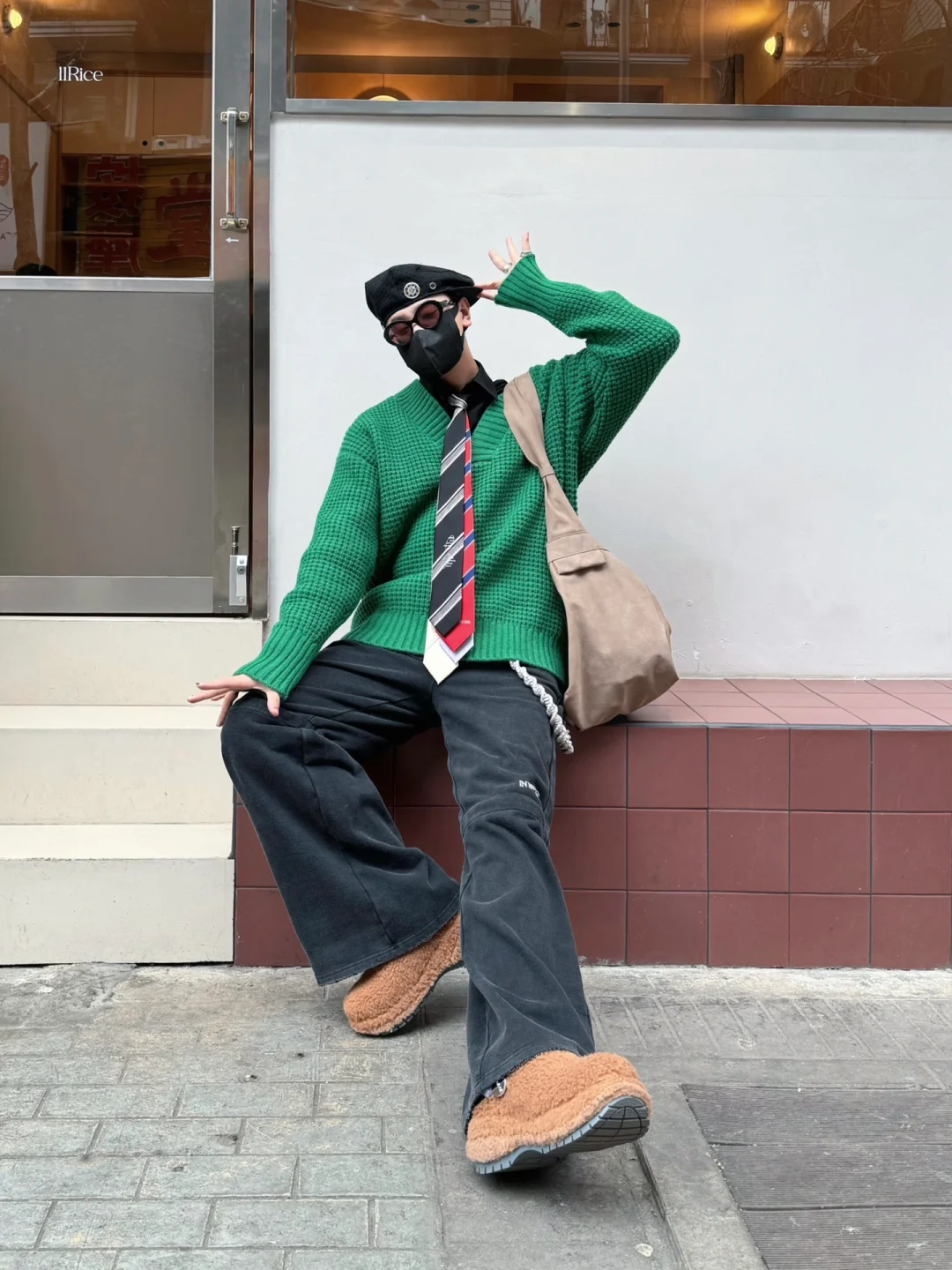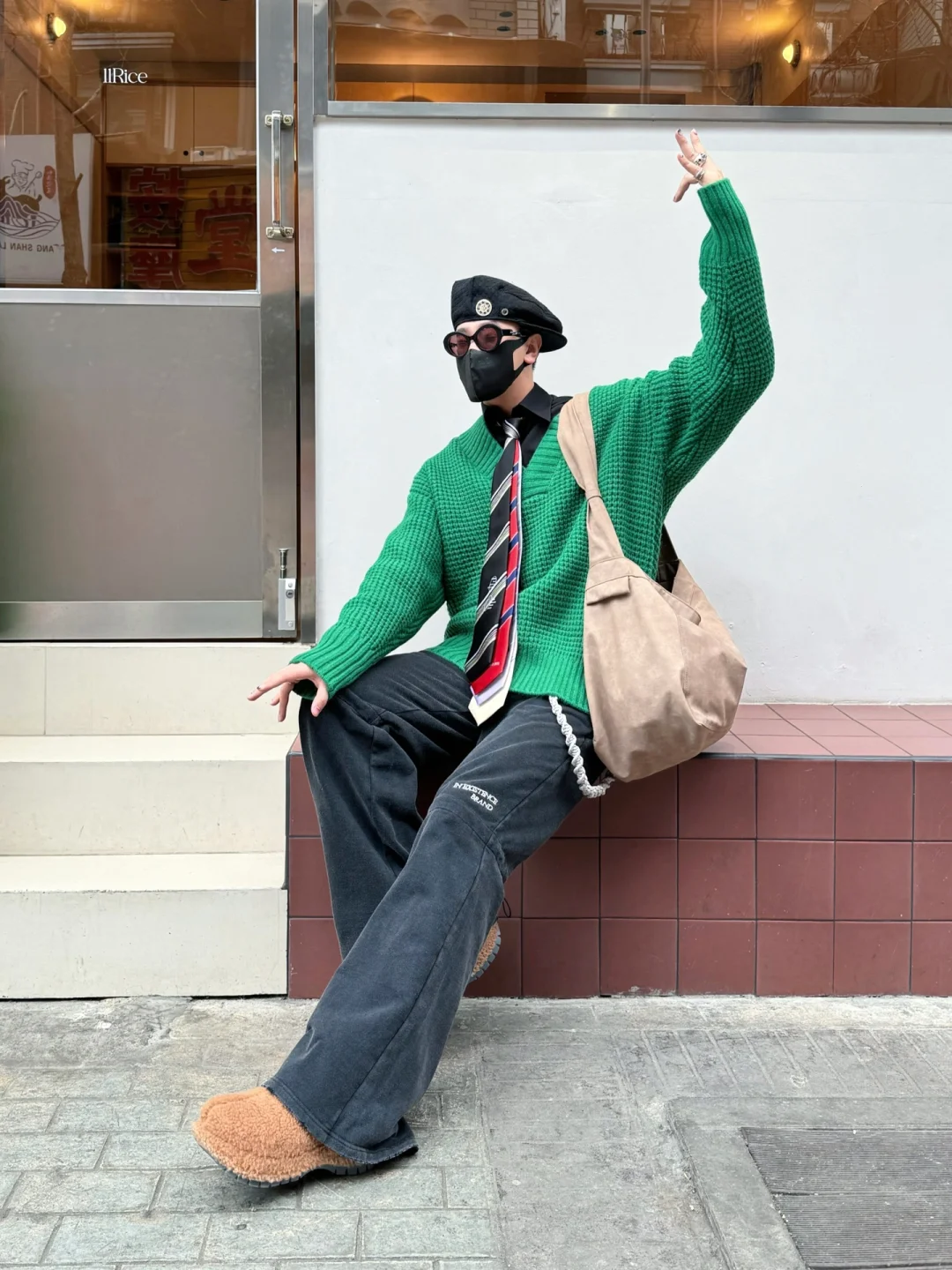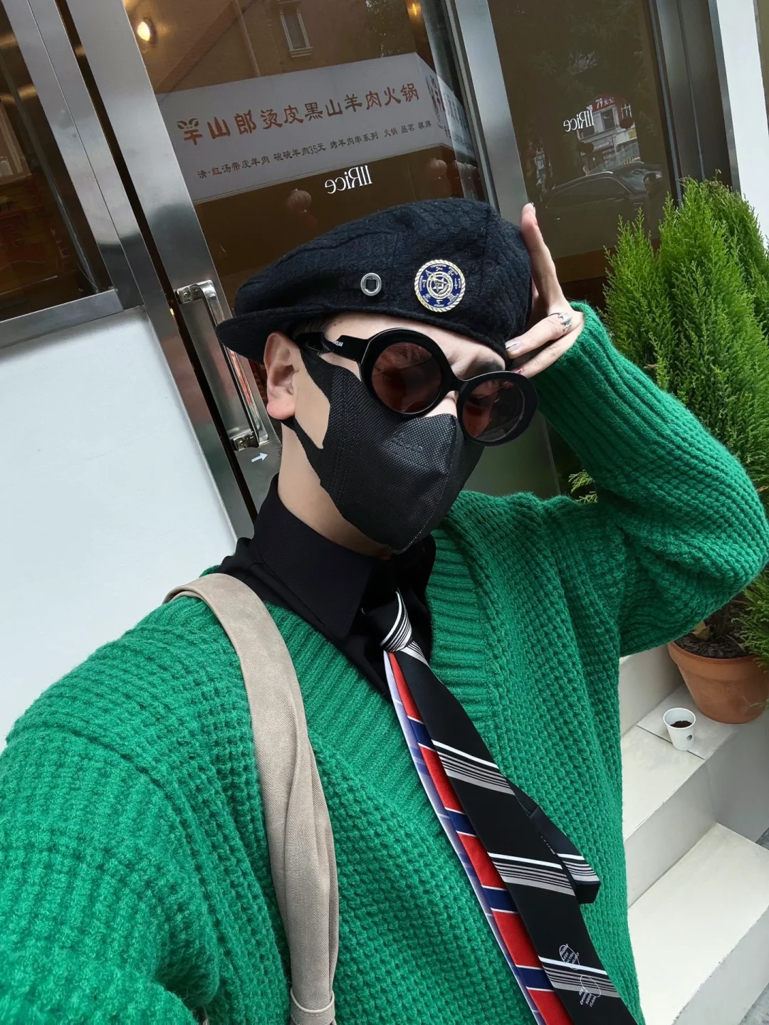 成都降温满大街空荡荡☁️那也要帅气出门❕ 今天是黑绿配🟢韩系男友风⚫️———素针织衫➕花领带叠搭,主次分明还能穿出层次感💡~ 下半身配做旧卫裤自然过渡✔️穿出大长腿, 踩一双厚底毛毛鞋🐫裤脚堆叠Vibe风拉满, 背同色系包包上下呼应✨墨镜➕贝雷帽是你的韩系男友吗🤵~ IIRICE的咸桃子和dirty我要再喝一万次哈哈😆❕ 开春保持浪漫💕穿成韩系绅士男友去约会吧💯~ - -