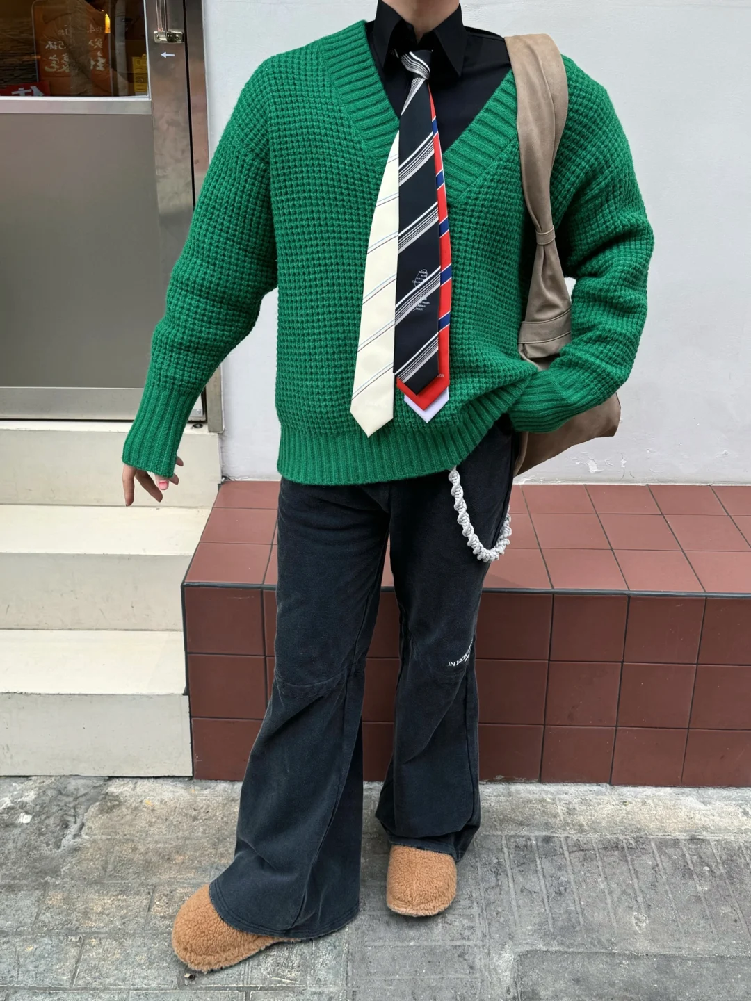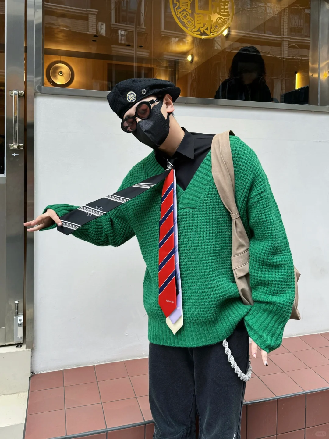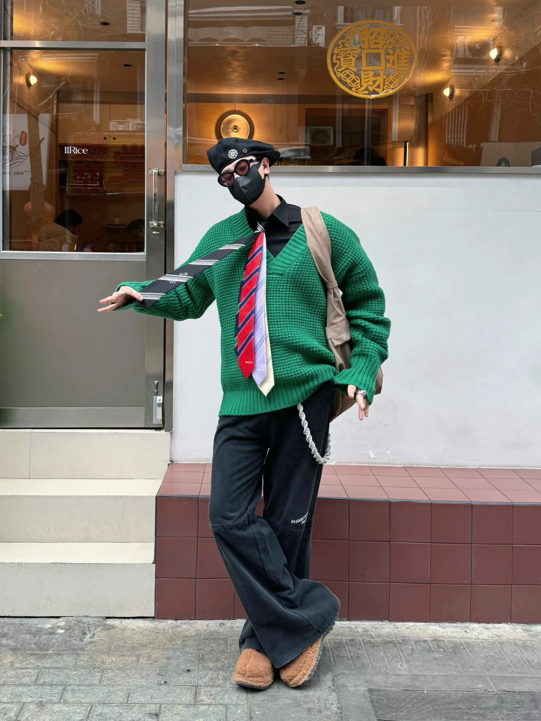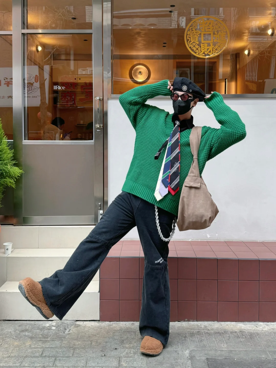 成都降温满大街空荡荡☁️那也要帅气出门❕ 今天是黑绿配🟢韩系男友风⚫️———素针织衫➕花领带叠搭,主次分明还能穿出层次感💡~ 下半身配做旧卫裤自然过渡✔️穿出大长腿, 踩一双厚底毛毛鞋🐫裤脚堆叠Vibe风拉满, 背同色系包包上下呼应✨墨镜➕贝雷帽是你的韩系男友吗🤵~ IIRICE的咸桃子和dirty我要再喝一万次哈哈😆❕ 开春保持浪漫💕穿成韩系绅士男友去约会吧💯~ - -