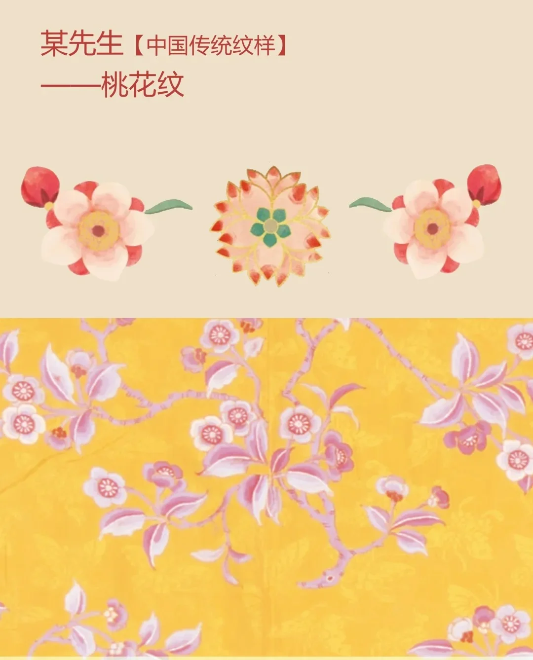 1️⃣桃花纹:桃花纹样多用于中国传统织物和瓷器上,象征春天和美好爱情,常与蝴蝶或鸟类搭配,寓意“蝶恋花”或“鸟语花香”。