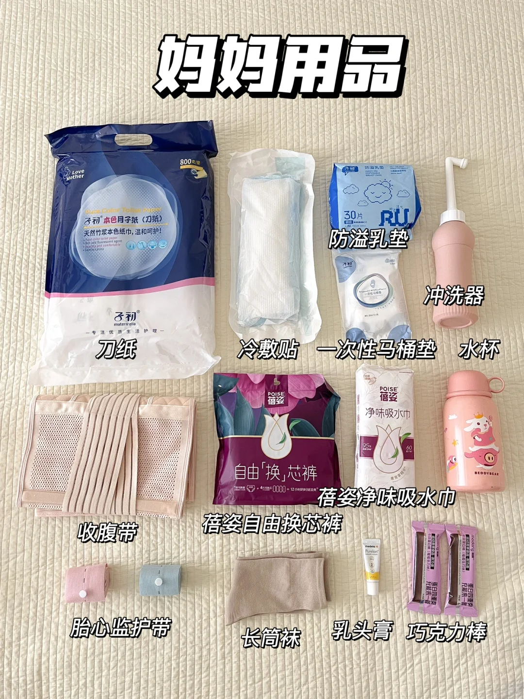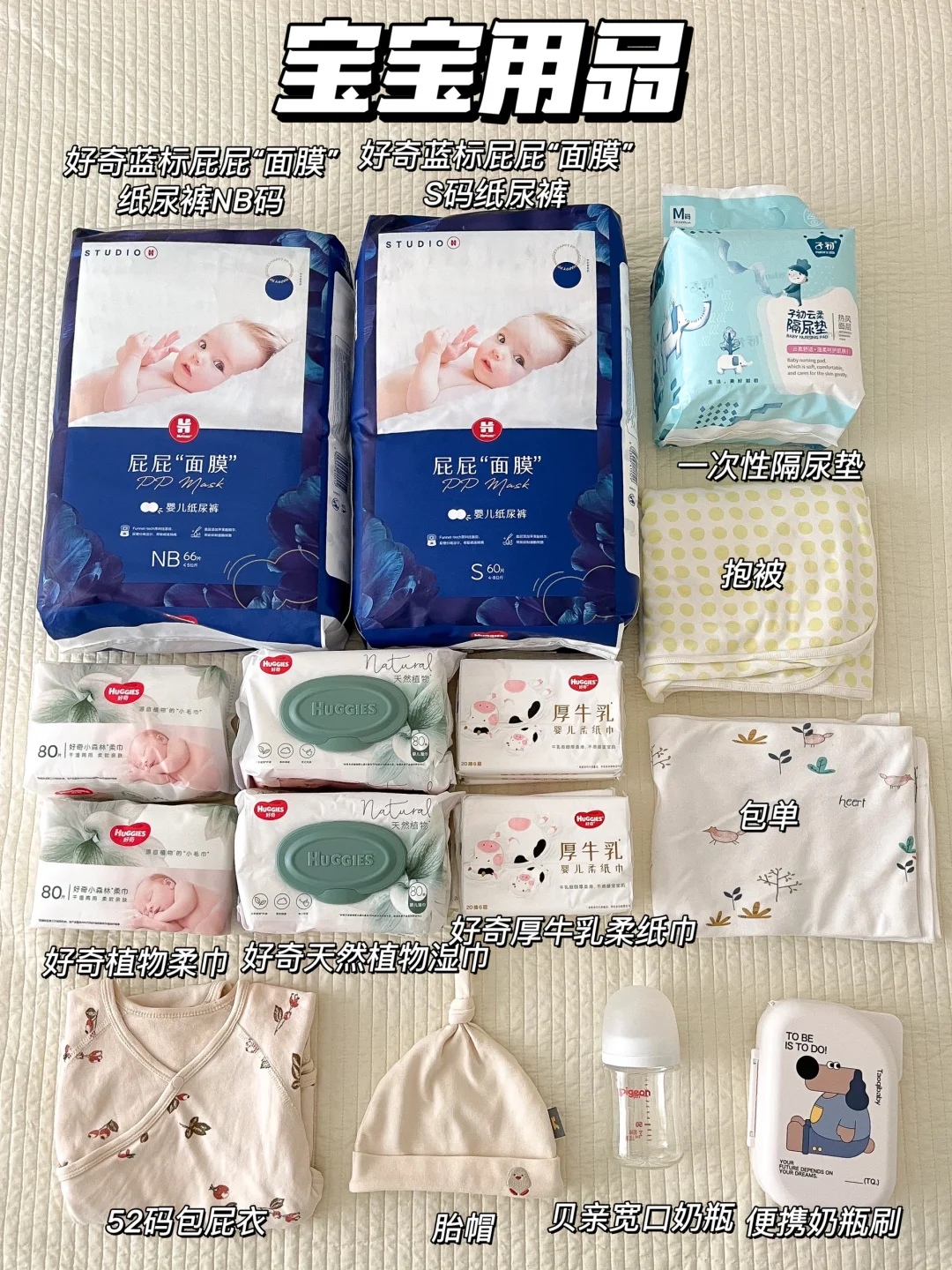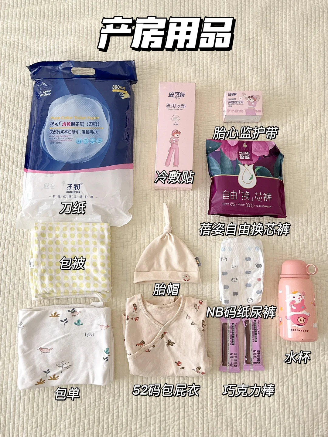 抱被、胎帽、52码小衣服、NB码纸尿裤、刀纸、换芯裤、胎心监护带、冷敷贴、巧克力棒、水杯