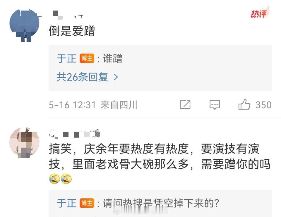 于正发文说“热播戏的续集就不必拿外人来祭天了吧”“多low!”这是回应的热搜说于正差点拍了庆余年吧[doge] 于正还顺便宣传了《墨雨云间》,看来他是对这部剧抱很大期望了[抱一抱]