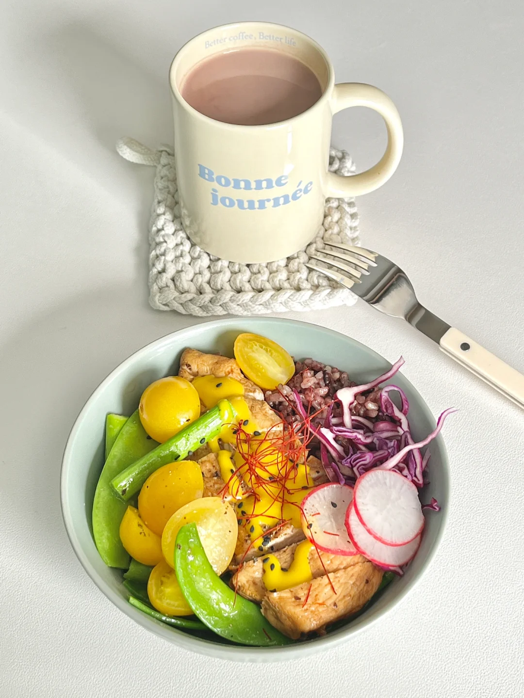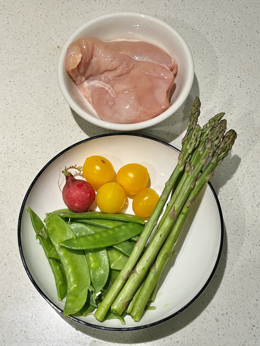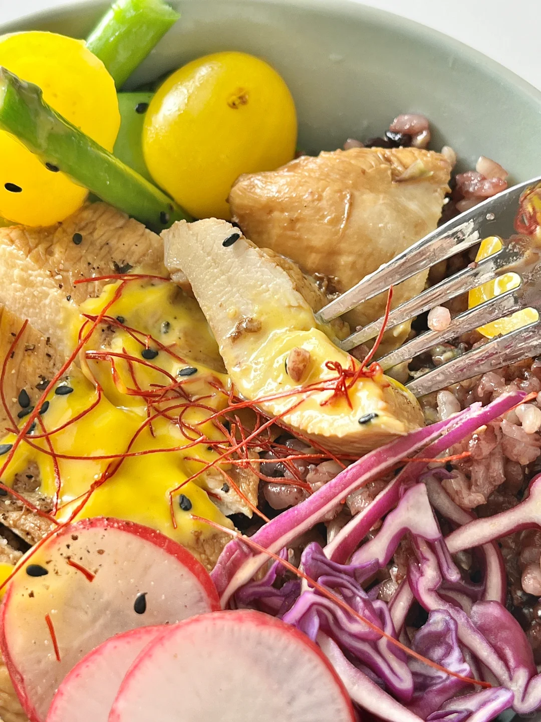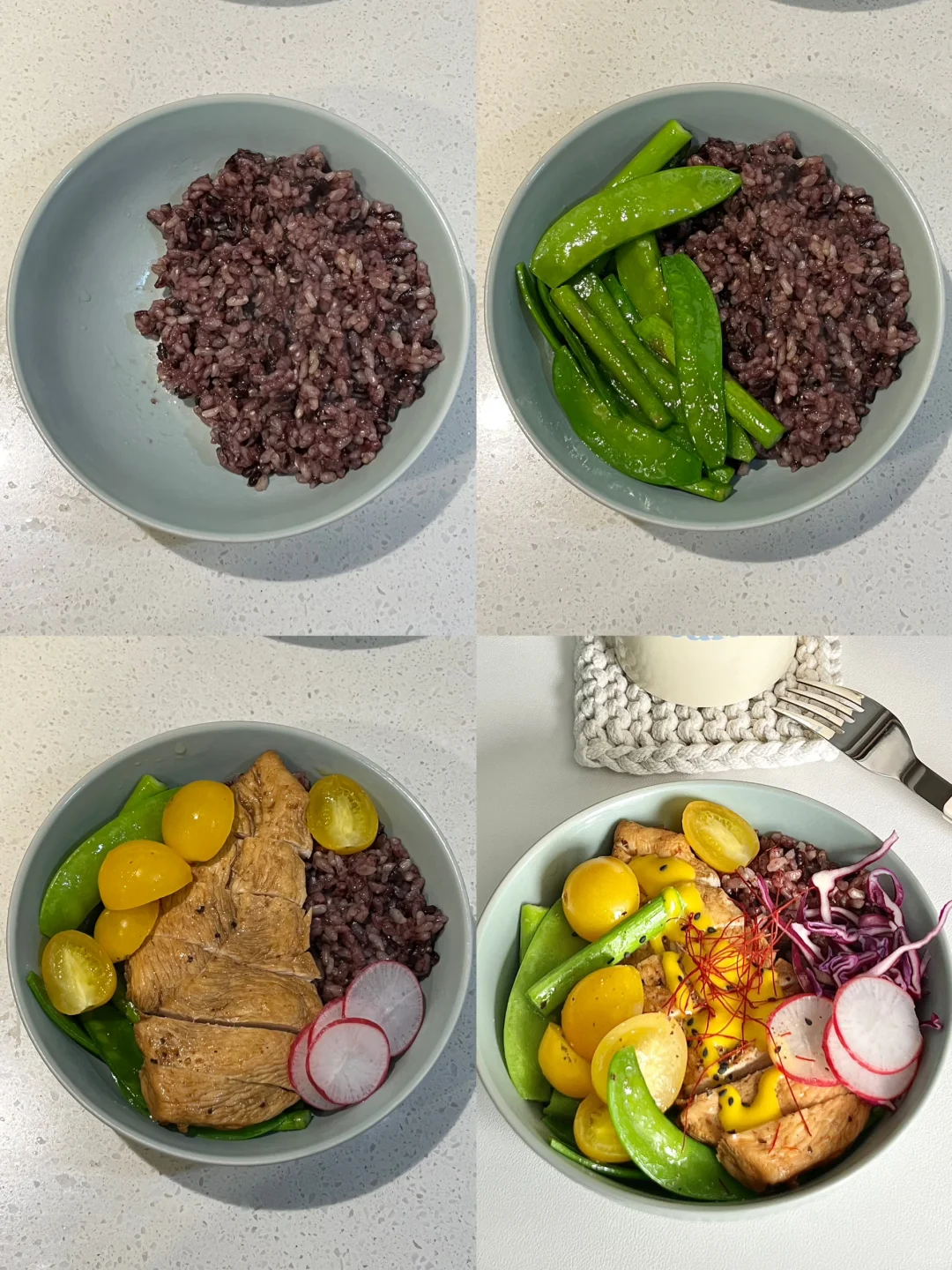 鸡胸肉拌饭🍚 大家假期快乐! 今天快速出餐 吃完去逛公园 做法在p4… _ 🥣食材: 鸡胸肉|杂粮饭|芦笋|紫甘蓝|荷兰豆|小番茄|萝卜|蜂蜜芥末酱 鸡胸肉和蜂蜜芥末酱真的很搭,也算是解馋版韩式炸鸡啦~ 祝大家吃的开心! 好好吃饭快乐减脂🧡