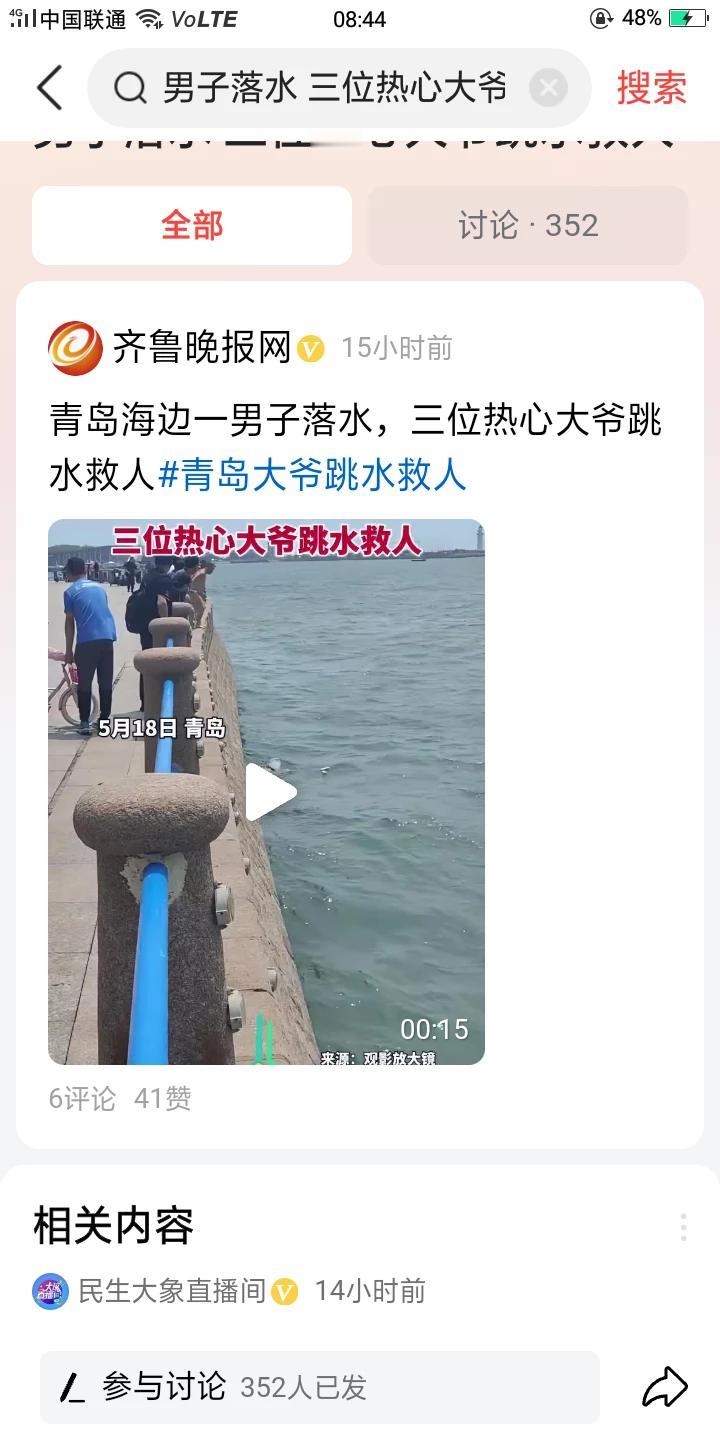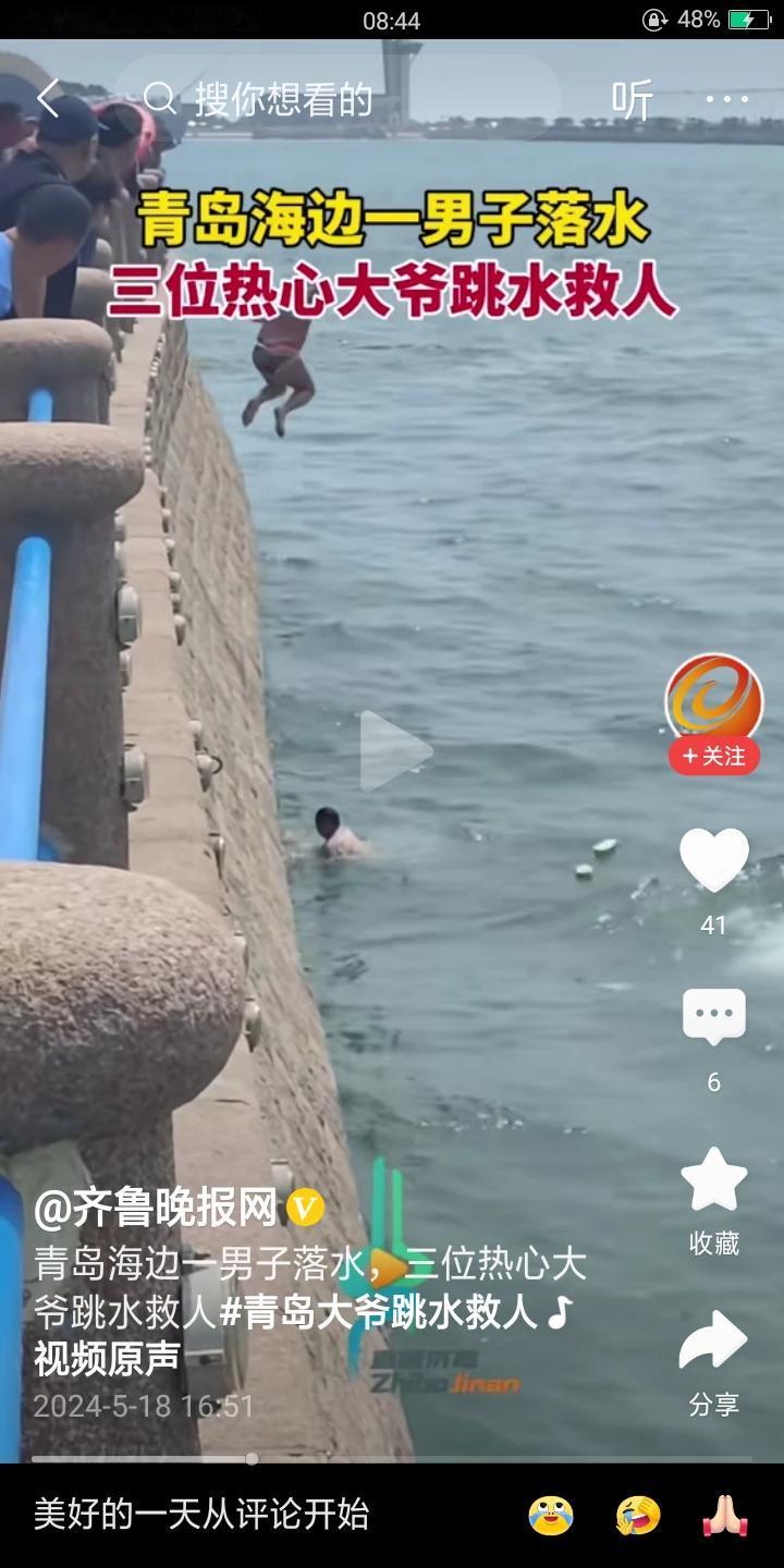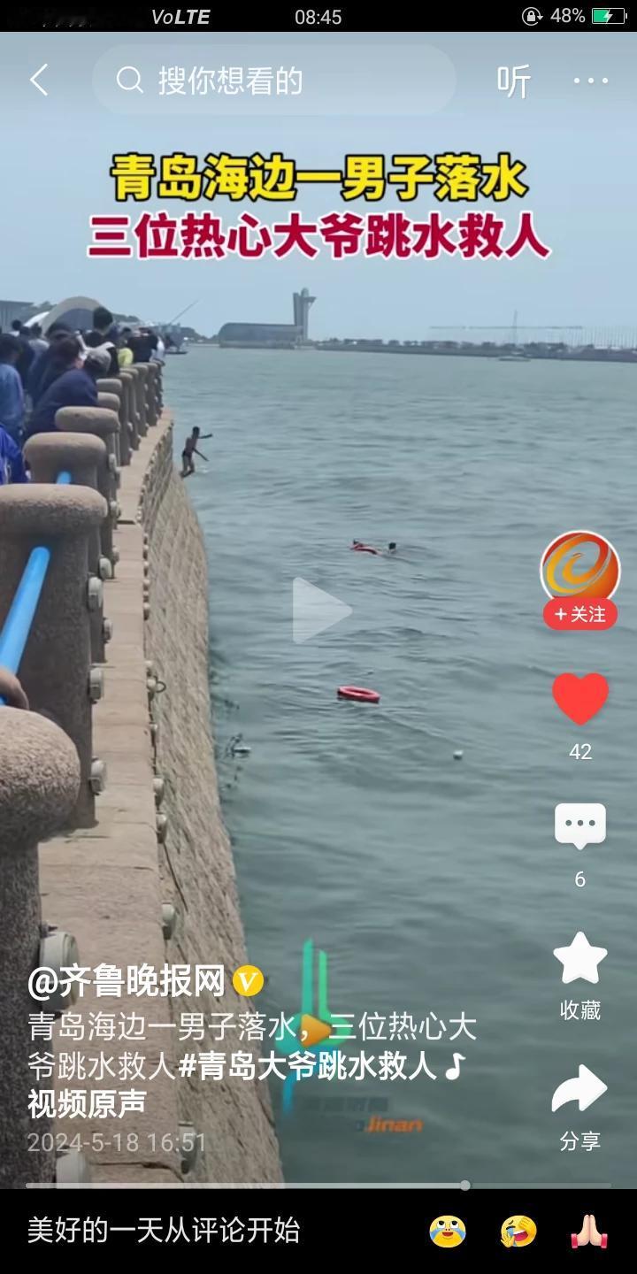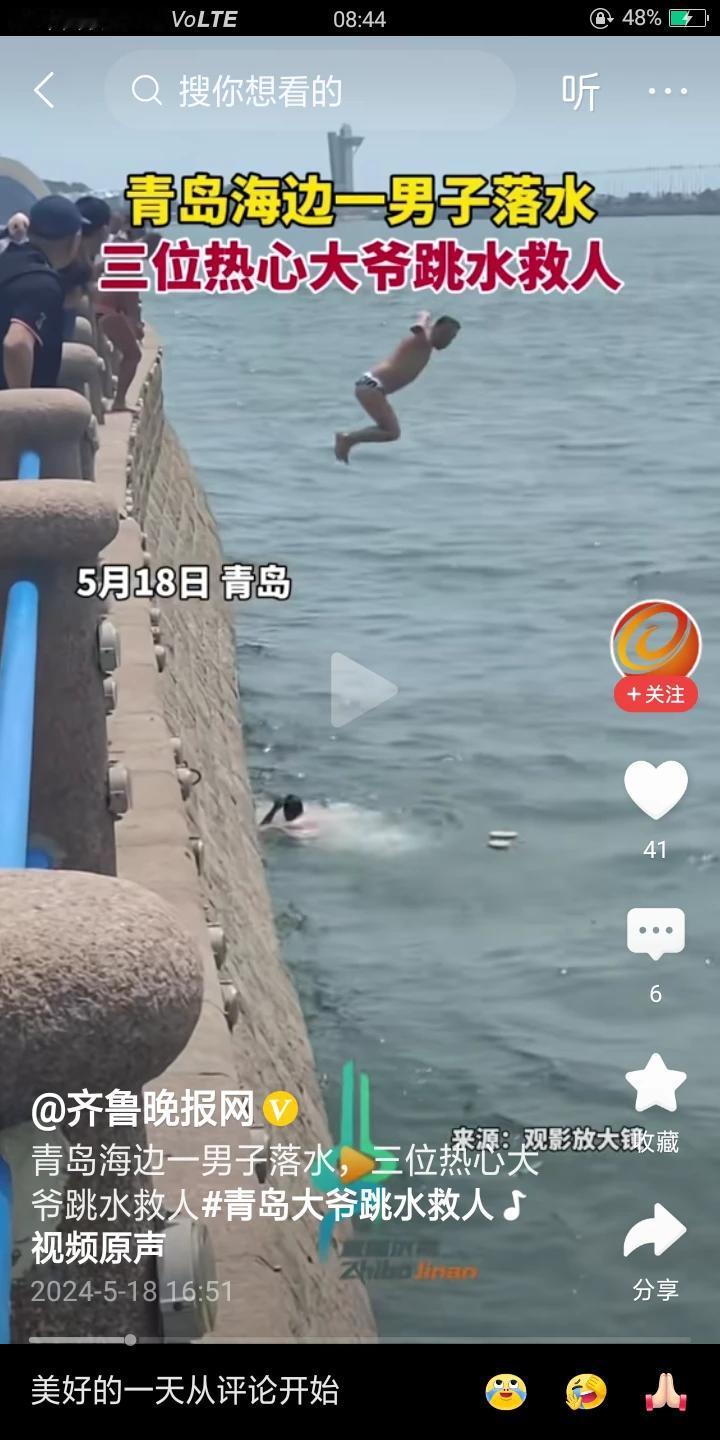 青岛人大爱无疆!!还是三个老爷子! 一跳,二跳,三跳! 青岛海边一男子落水,他不会游泳,正好被这三个大爷看到了,他们先是扔下一个游泳圈给男子,他们就毫不犹豫的跳下水去救人了。 我们都知道,一个年轻的成年男子落水后如果是一个救他肯定吃不消,搞不好自己都会丢了性命,可是这一下有三个老人救了男子,真的是该给他们颁发见义勇为奖章啊! 因为前几天山东小伙救一对落水母子后体力不支溺亡。 山东人,好样的,不愧是孔孟之乡啊。没让我们失望。人杰地灵,当代活雷锋最多的地方。
