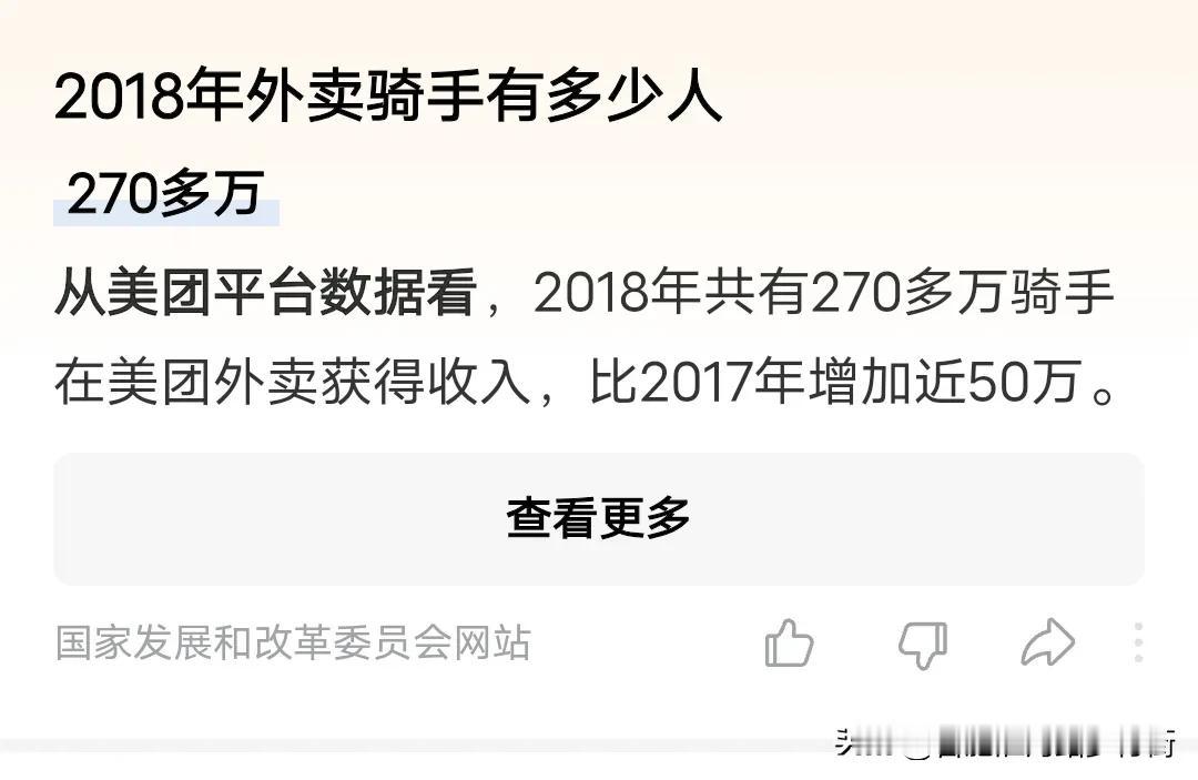 很多外卖骑手抱怨美团,饿了么资本家吸血鬼一单才几个钱。首先看个数据:2018年中国外卖骑手仅仅只有270万来人,而2024年中国外卖骑手突破1300万人,说句不好听的你觉得这几年的经济有2018年经济繁荣昌盛吗?外卖市场就是一块固定规格大的蛋糕,本来270万骑手分这蛋糕,觉得挺不错的累点也能挣大钱,可现如今多了1000万人来分这一块蛋糕,那么你觉得大家到手的钱能多吗?经济学角度来说:外卖骑手早就饱和了已经是过剩了,你还想着去做外卖挣钱和前几年一样,那就是扯淡了。外卖骑手以及网约车都是一样的过剩职业,而不是美团平台压榨骑手,你要明白一点人多的行业不值钱的。