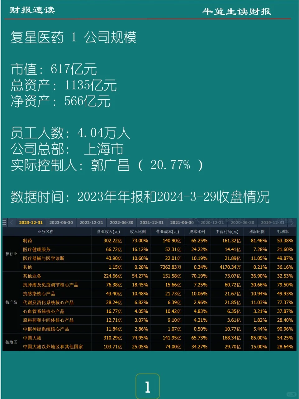 上海复星医药(集团)股份有限公司主营业务是制药、医疗器械、医学诊断、医疗健康服务。主要产品为心血管系统疾病治疗领域核心产品、中枢神经系统疾病治疗领域核心产品、血液系统疾病治疗领域核心产品、代谢及消化系统疾病治疗领域核心产品、抗感染疾病治疗领域核心产品、抗肿瘤治疗领域核心产品、原料药和中间体核心产品。