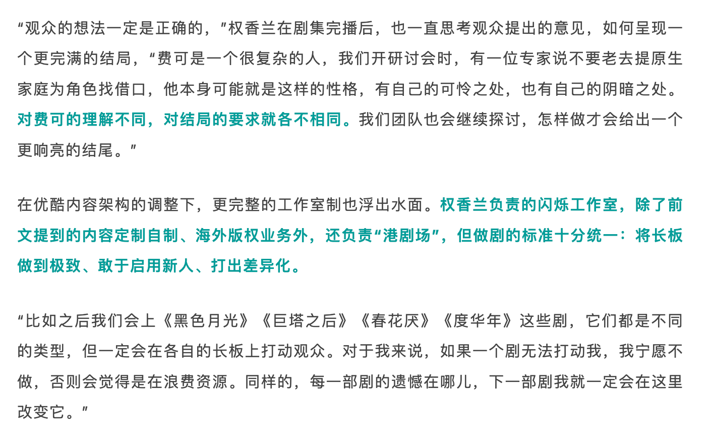 #剧集新生# 提到观众对《新生》的评价,优酷闪烁工作室负责人、《新生》监制权香兰回应:“观众的想法一定是正确的。费可是一个很复杂的人,我们开研讨会时,有一位专家说不要老去提原生家庭为角色找借口,他本身可能就是这样的性格,有自己的可怜之处,也有自己的阴暗之处。对费可的理解不同,对结局的要求就各不相同。我们团队也会继续探讨,怎样做才会给出一个更响亮的结尾。”