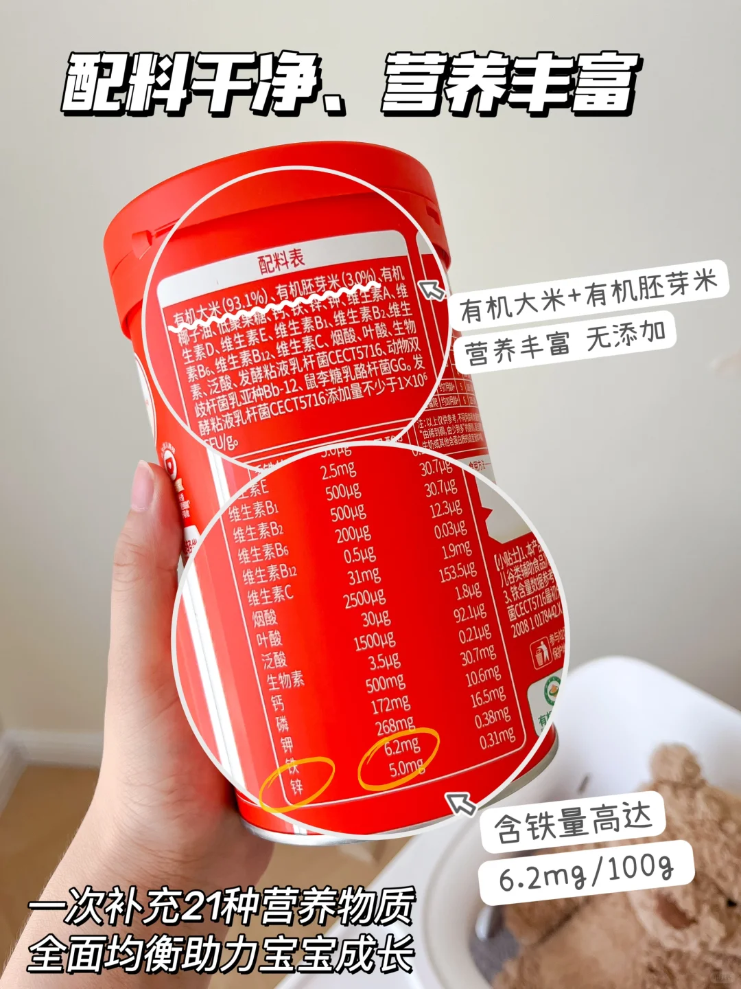配料干净,搭配多种营养元素!选择无添加的,比如糖、盐、香精、防腐剂等,敏宝要注意是否含有乳品、麸质谷物、大豆等易过敏的原料添加