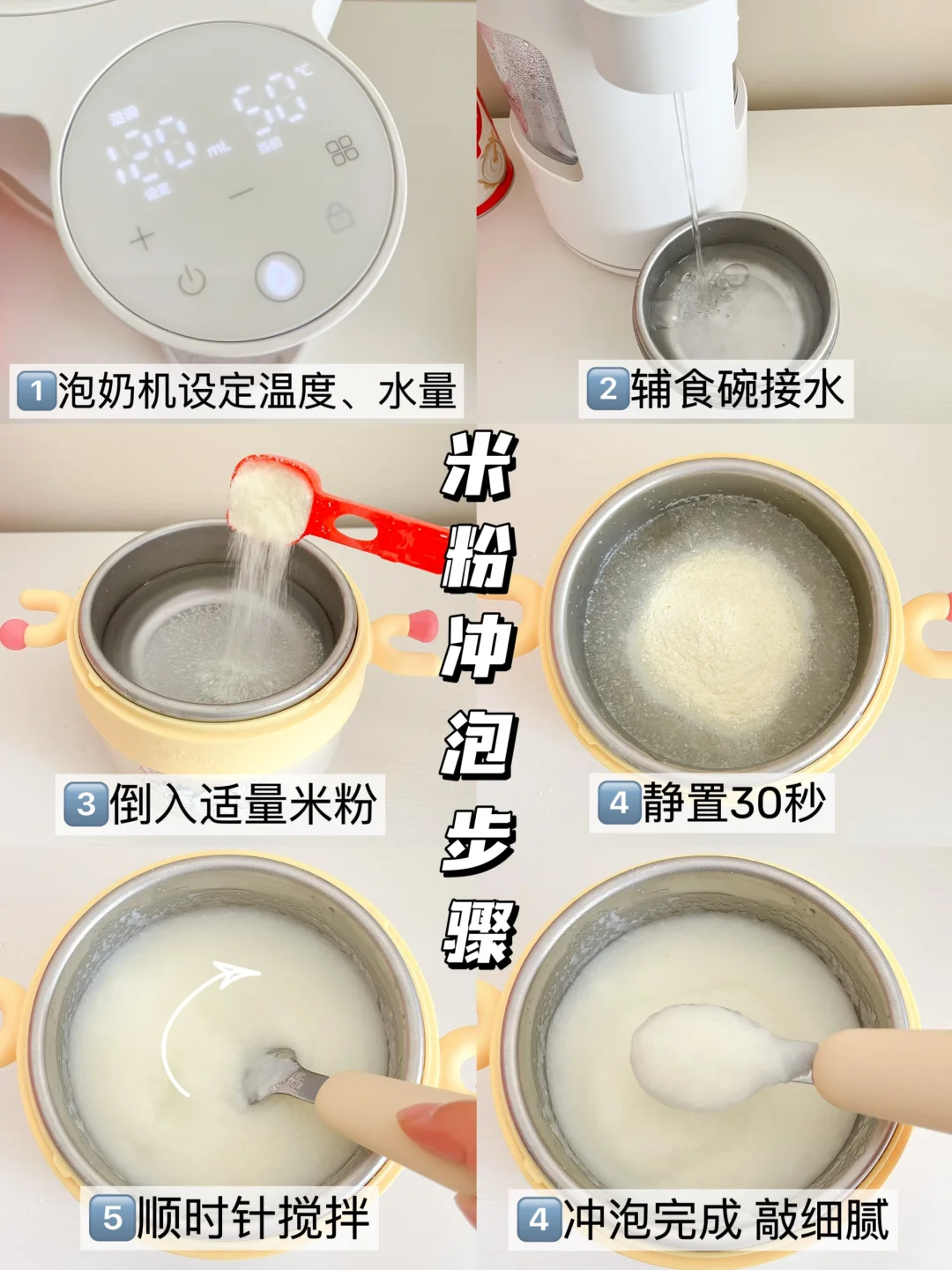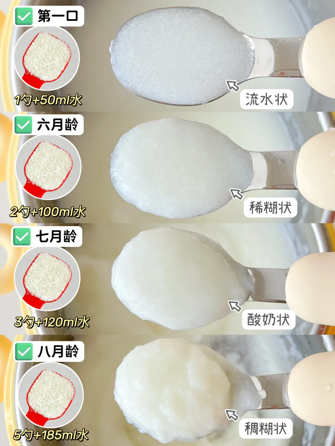 第一口米粉流水状过渡到➡️稀糊状➡️7月龄酸奶状➡️8月龄稠糊状