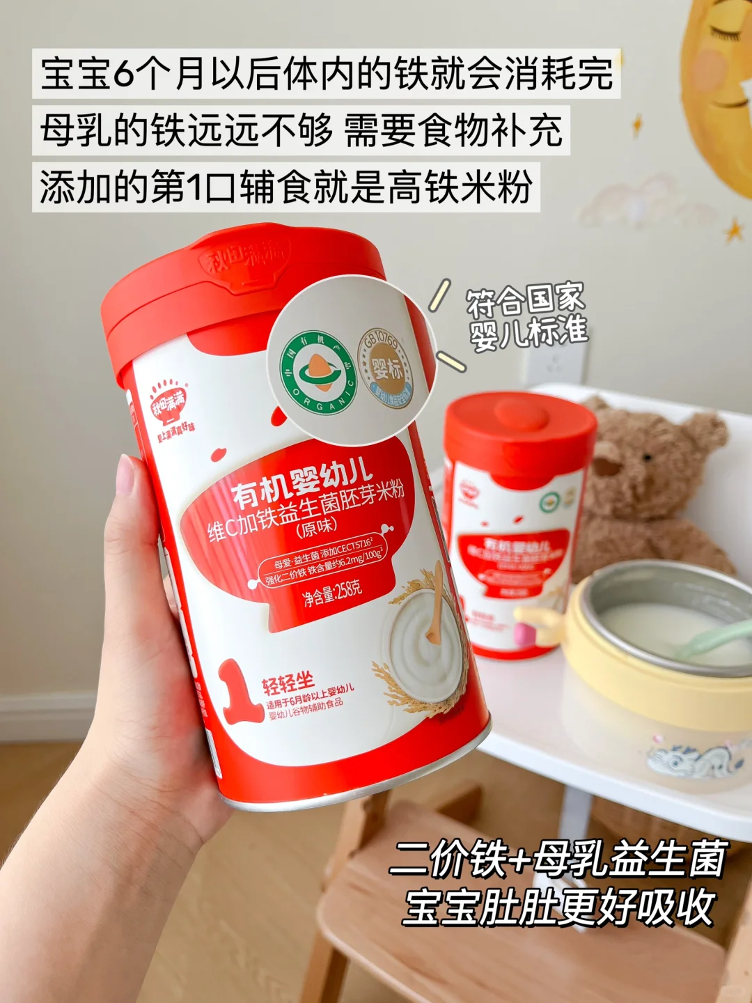 我家现在吃的是秋田满满母爱益生菌米粉,它的铁含量高达6.2mg/100g,比市面上大部分米粉含量都高👍并且是二价铁搭配维生素C更好吸收,还添加了母爱益生菌CECT5716也更亲和小肚肚!