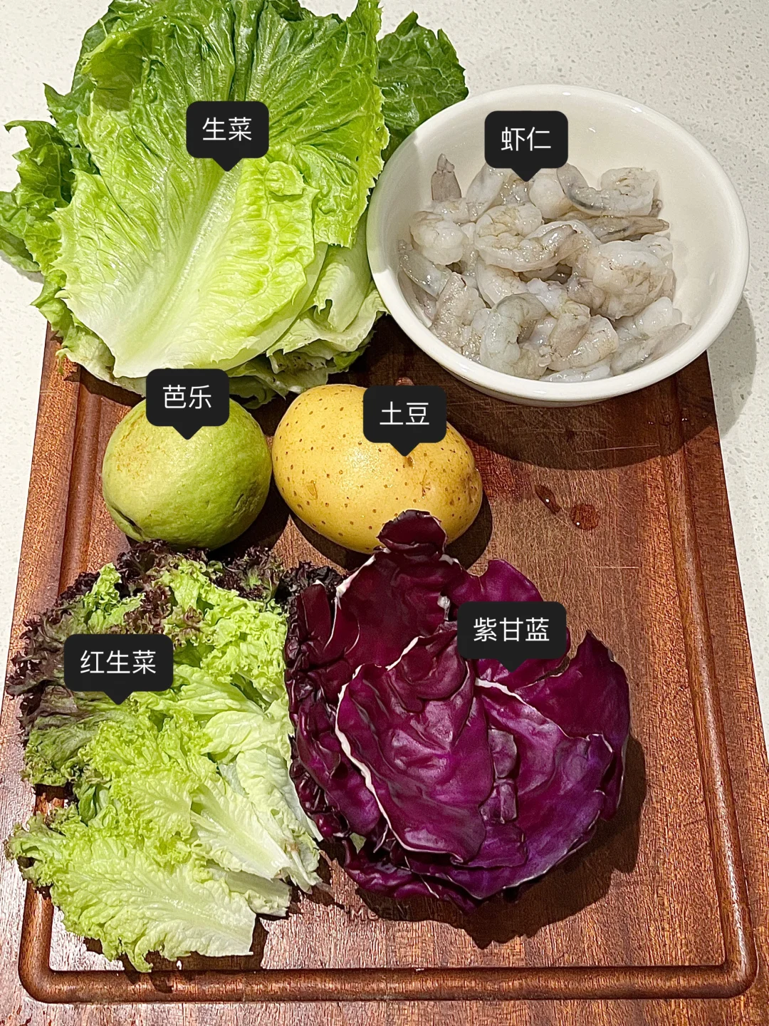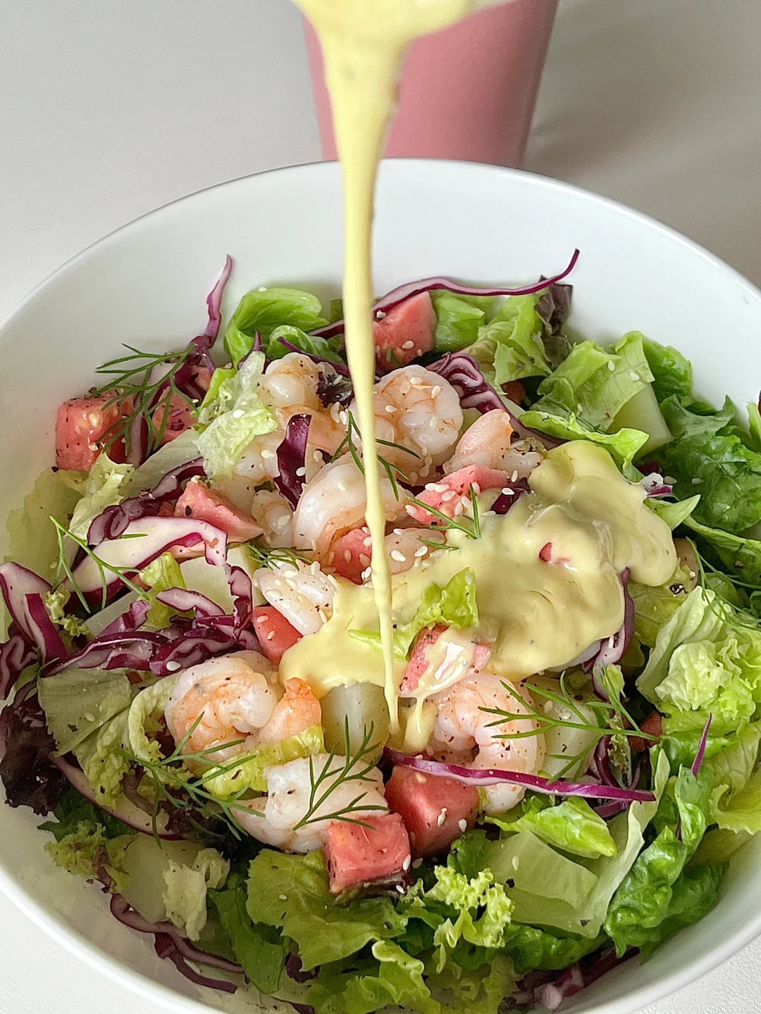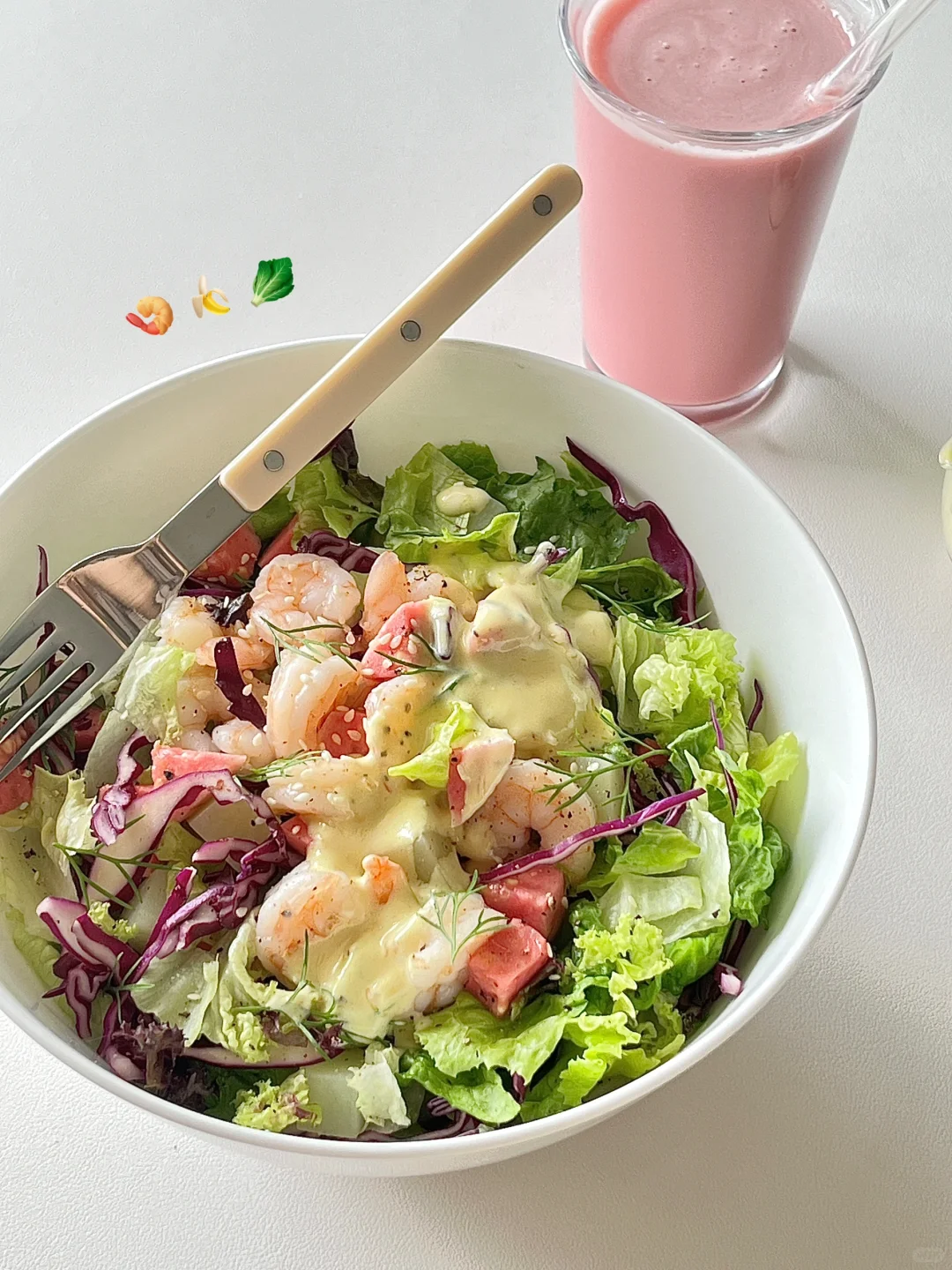 芭乐沙拉 芭乐榨汁… 又是消耗芭乐的一天…囤水果需谨慎🫨 蜂蜜芥末味儿的沙拉,果汁是芭乐香蕉酸奶 酸酸甜甜的很清爽,快来一起吃叭! - 🥗食材: 虾仁|芭乐|生菜|土豆|紫甘蓝 🧂酱汁: 酸奶+蜂蜜芥末酱+熟芝麻+亚麻籽油 📄做法: 1.虾仁洗净腌制一会煎熟 2.土豆煮熟,水果蔬菜洗净切好 😋祝大家吃的开心! 🩷好好吃饭快乐减脂!