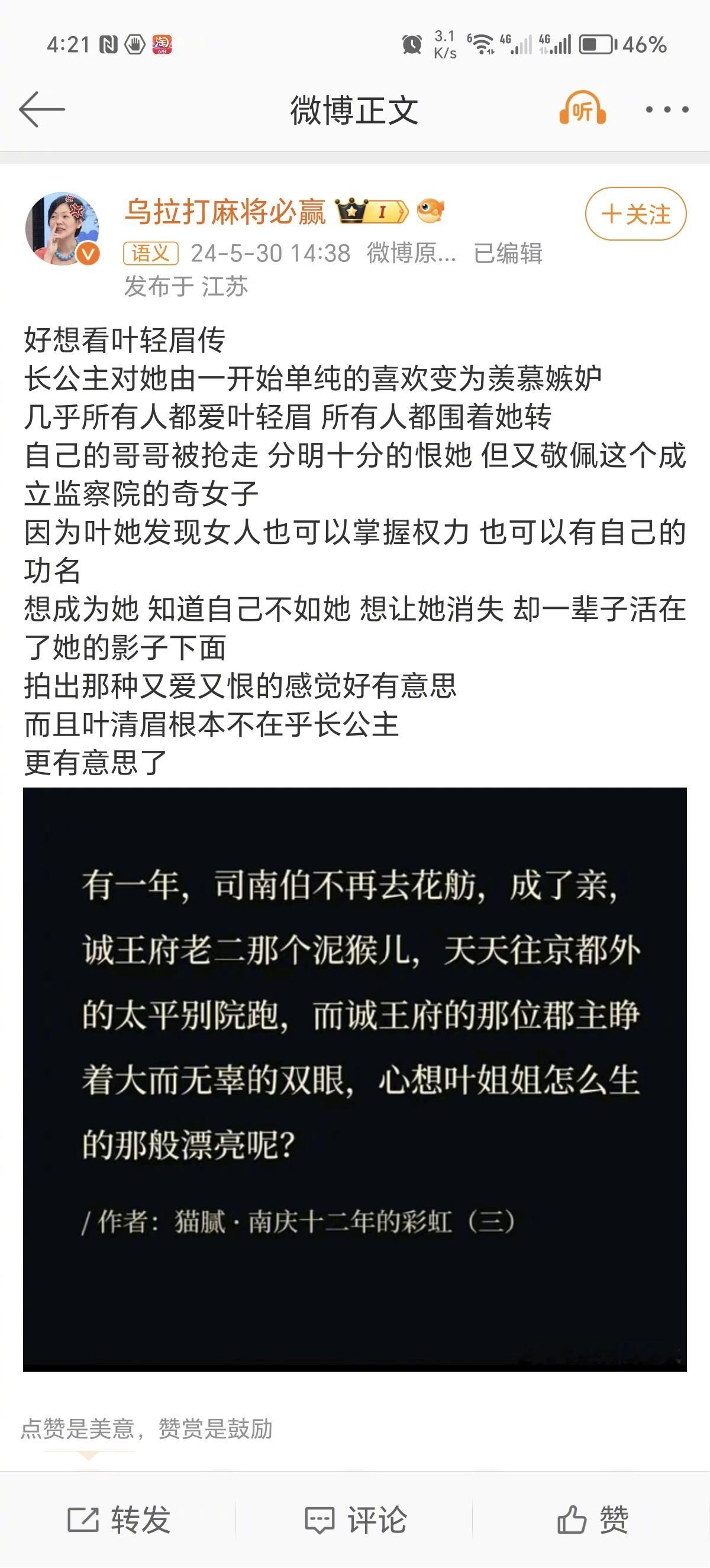 咱就是说,但凡叶轻眉当年亲李云睿一口呢!长公主现在都不至于这么恨范闲!又爱又恨的女双强,这一对儿也好带感!!![泪]