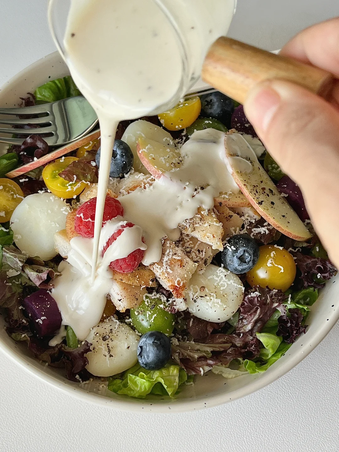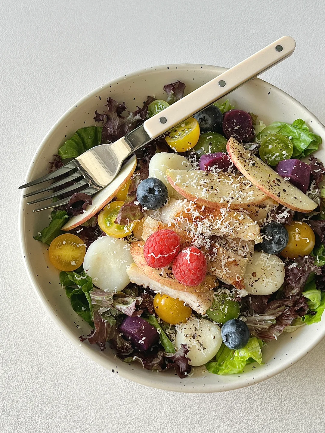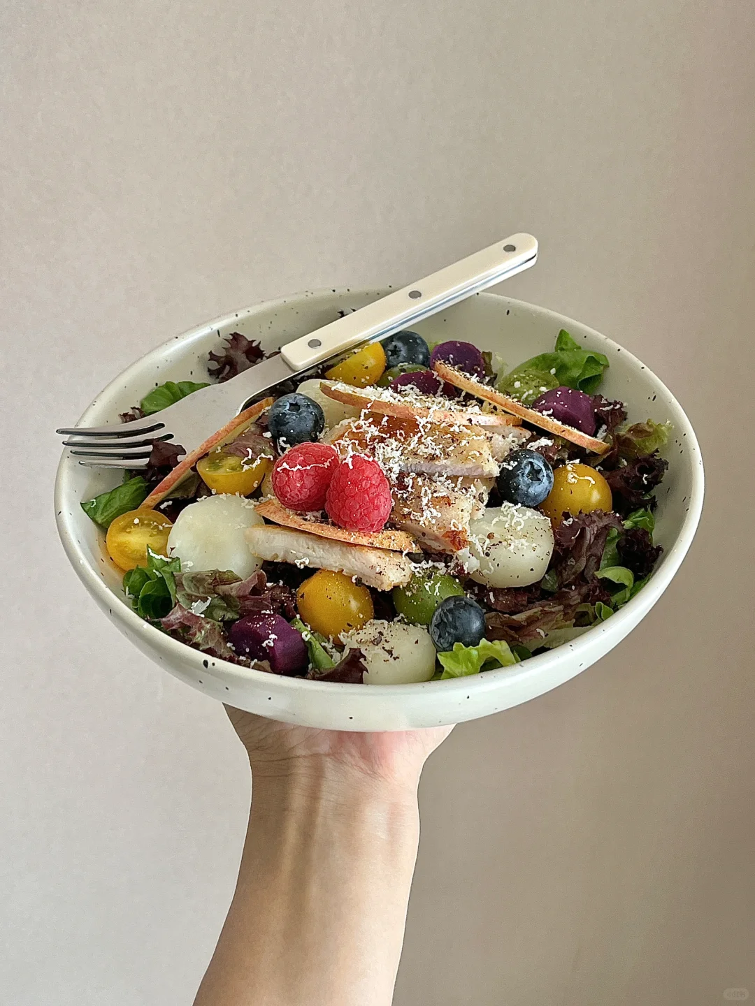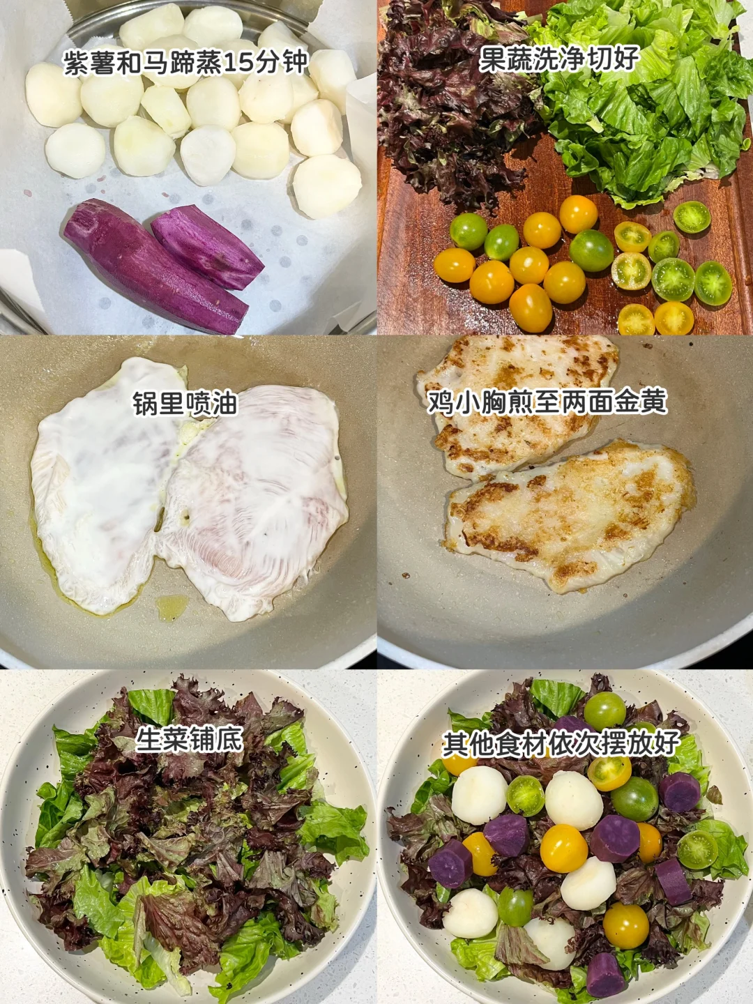 鸡排+马蹄的奇怪组合,意外的好吃! 今天买的马蹄又脆又甜,再来一杯巴西莓牛奶结束周末,开吃吧! - 🍗食材: 鸡小胸|马蹄|紫薯|生菜|圣女果|苹果|蓝莓|树莓|帕玛森芝士 📄做法:p5 1.紫薯和马蹄蒸熟,蔬菜切好 2.煎熟鸡小胸切块 3.洒一些帕玛森芝士和胡椒盐 🧂酱汁: 凯撒沙拉汁+酸奶+蜂蜜 祝大家吃的开心! 好好吃饭快乐减脂🥳