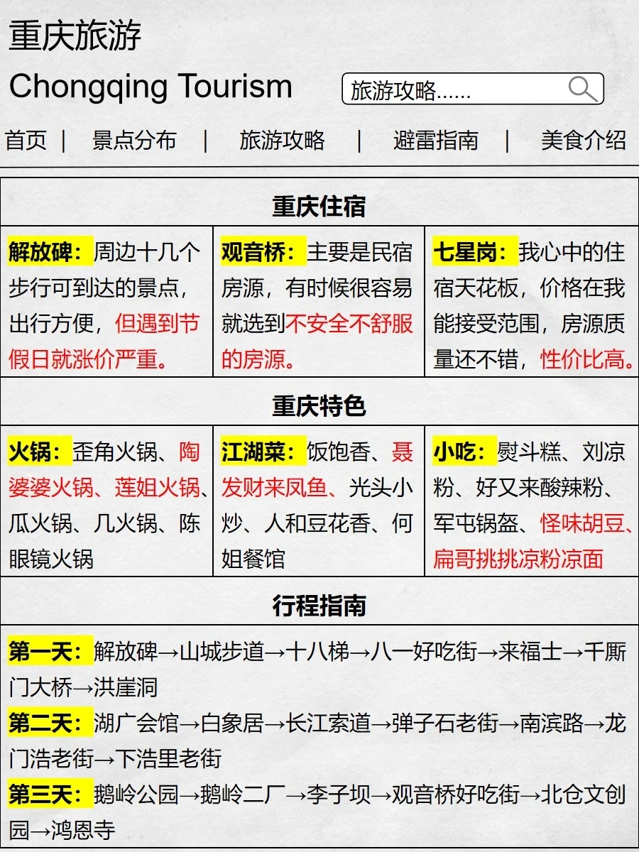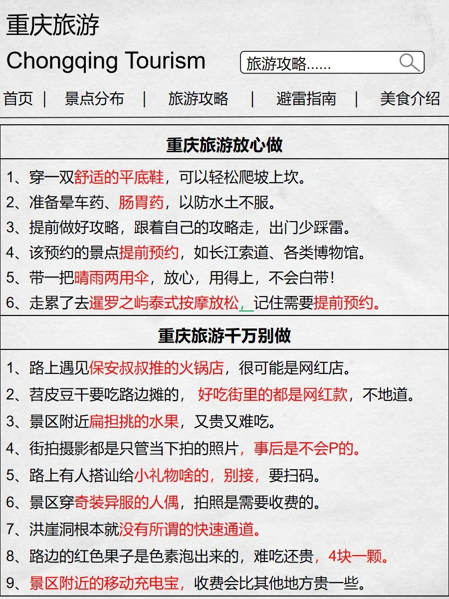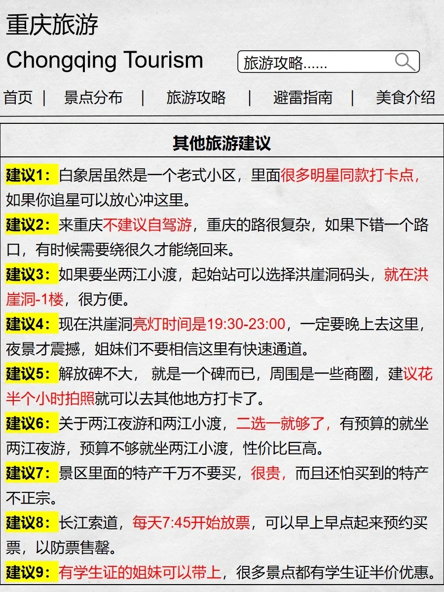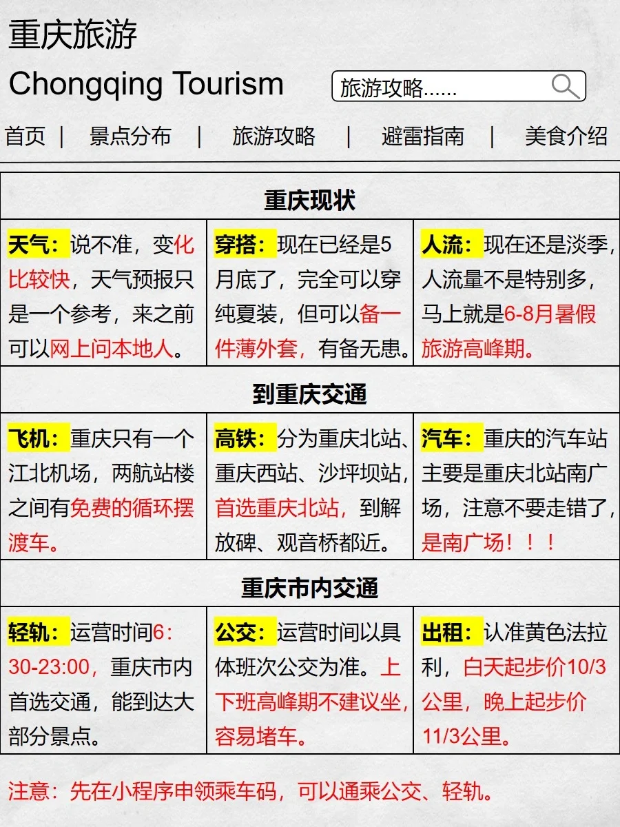 6-8月准备来重庆的朋友,到时候中考生、高考生、大学毕业生,大家都准备暑假旅游,不敢想象那时候的重庆有多热闹,人流有多夸张。所以,现在再不做攻略的朋友就晚了!天气热+人挤人+到处踩雷,体验感一定巨差。