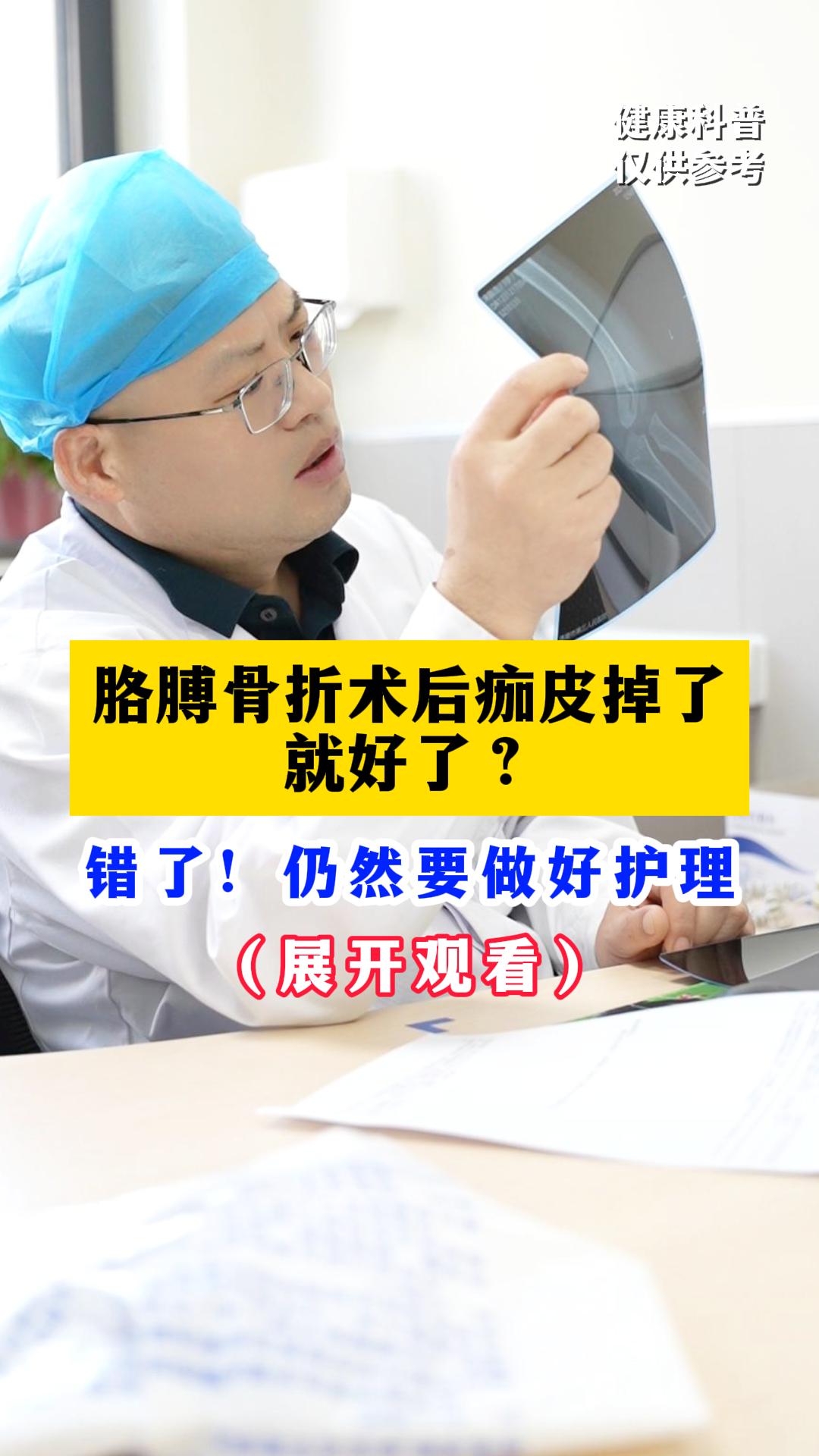 胳膊骨折术后痂皮掉了 就好了?。错了!仍然要做好护理。大家好,在临床上有些上肢骨折或者做其他手术的病人,在手术后,随着皮肤的自我修复,在伤口局部会结痂,结痂脱落后,表明伤口已经愈合,很多人以为这就是好了,不注意防护,结果对皮肤或者骨折部位造成二次损伤。 在结痂脱落后,虽然皮肤已经长好,但是还没有完全恢复到正常的皮肤状态,局部皮肤细胞比较嫩,很敏感,不能受到寒冷或者高热的刺激,病人在日常也要做好护理工作,避免局部皮肤受刺激,避免用手去抠,否则会损伤到皮肤而诱发感染,甚至留下疤痕。