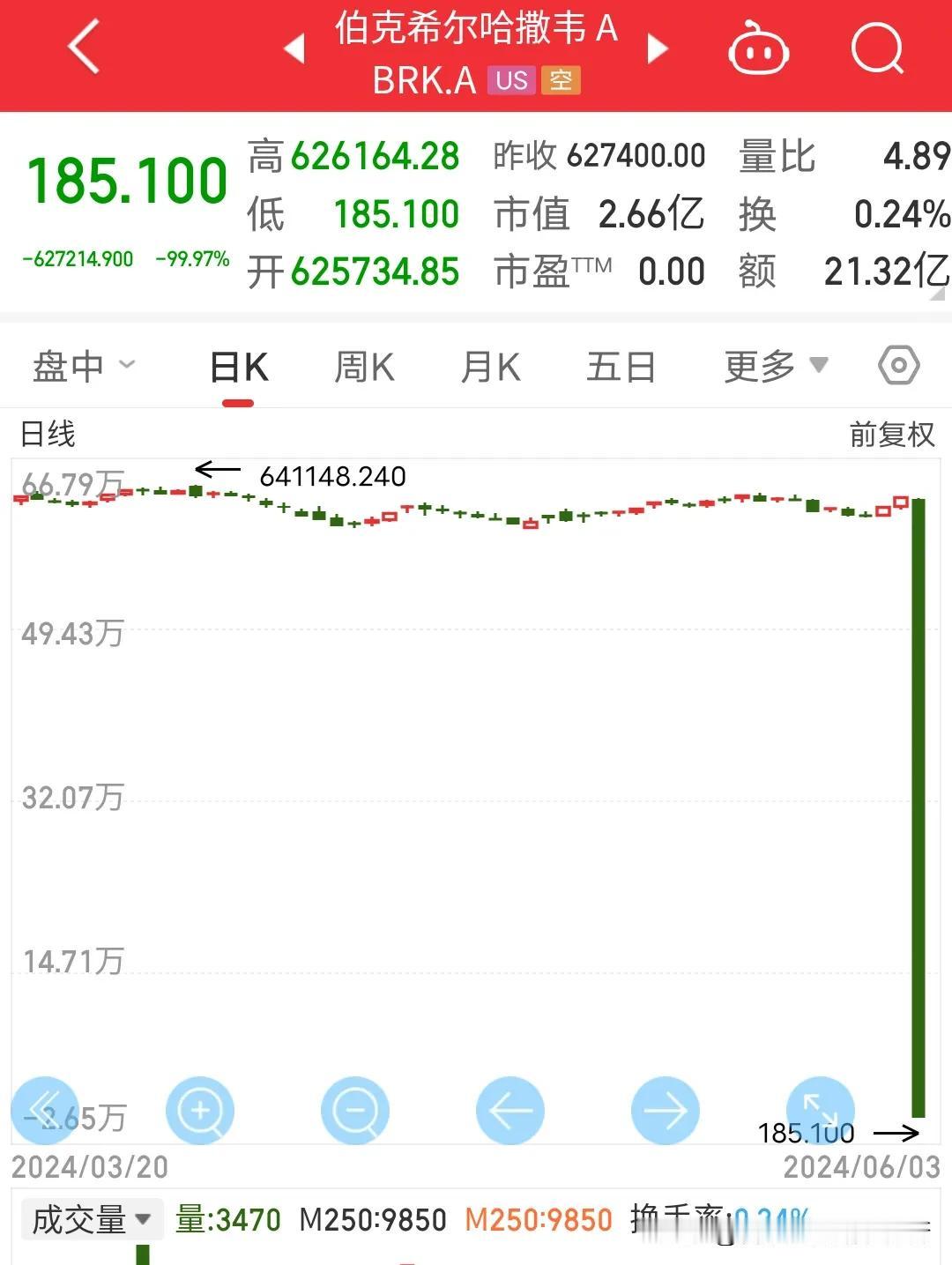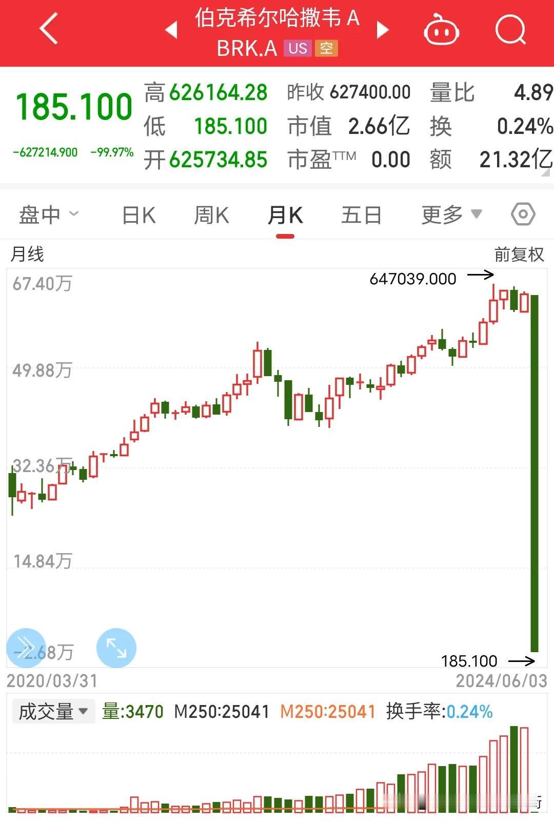 啥情况?惊呆全球股民,股神巴菲特的公司股价跌了99.9%?从62万美元一瞬间跌成了185美元?闪蹭跌停?美国股票也开始学习中国股票了?这到底出了啥问题?巴菲特公司要破产倒闭了吗?还是软件崩溃了?股价怎么一瞬间跌没了呢?