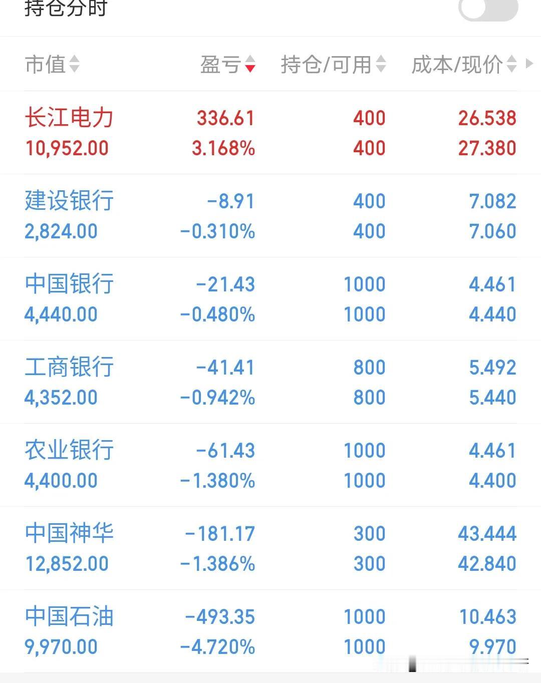技术性调整不用担心,最多还有440点下跌空间,也就是一个跌停板加3.3%跌幅而已嘛。行情终结者往往都是从买几百股开始到一路下跌清仓结束,四大行稳得一批几乎没亏什么,神油亏得有点多,咋滴啦?中东不打仗了吗?搞得原油期货也崩了,而中国神炭也还行正常波动没亏啥,而中国神电长江电力实在太猛了不断历史新高,长江电力浮盈抵消了四大行加神华浮亏,算下来也就是原油崩了导致石油今天股价大跌,不然这组合投资还真亏不了钱。当然买了这些股票有一点好:不用担心看盘啥的,崩盘时自有国家队来接盘。