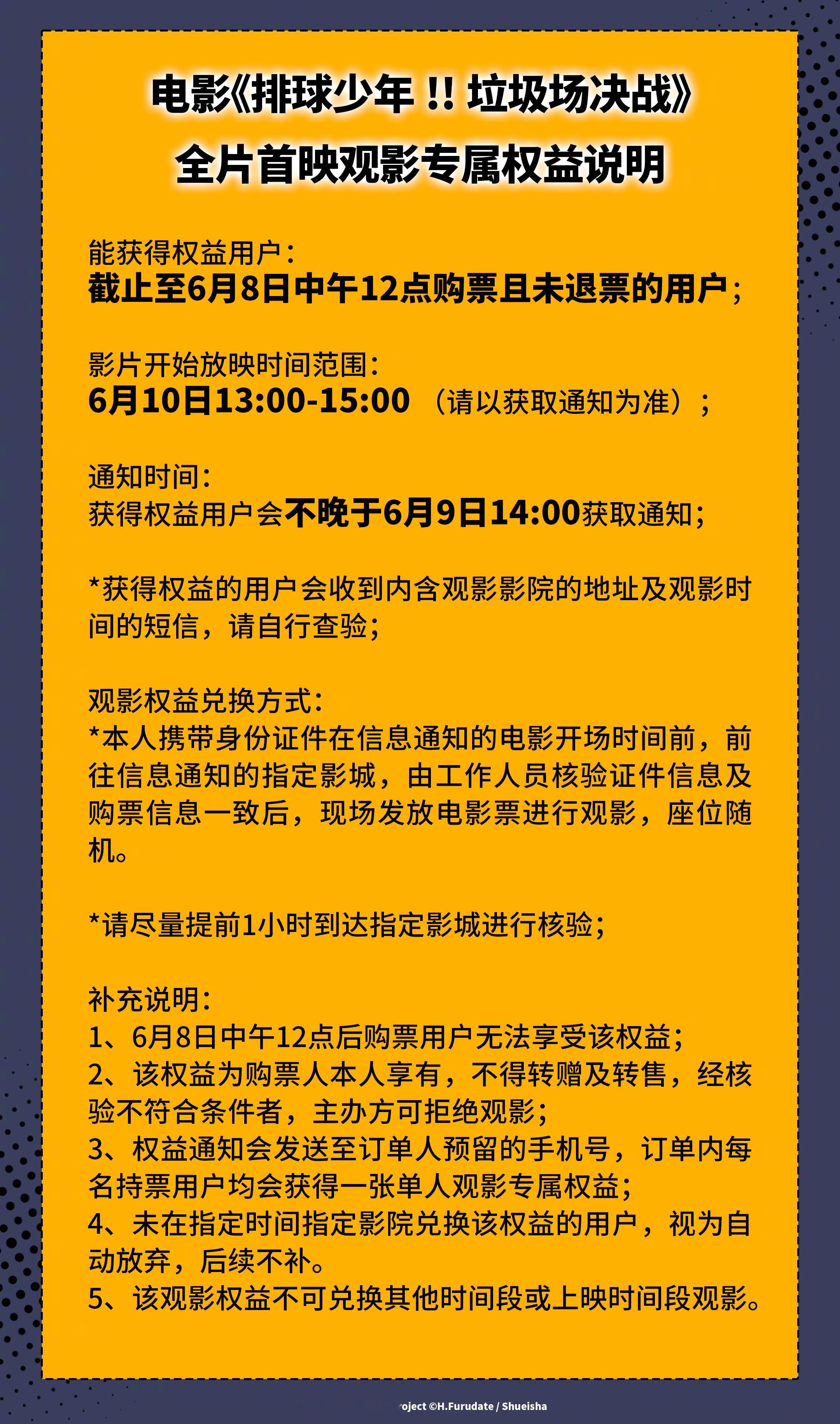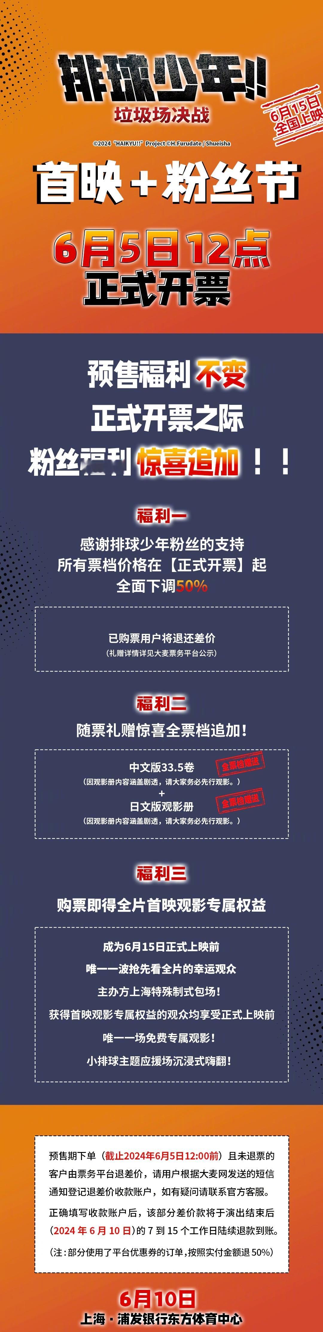 #电影排球少年粉丝节开售#排粉们有福啦!排球少年首映粉丝节6月5日12点正式开票!主办方也太宠粉了,全票价整体下调50%,全票档还在原有赠礼基础上追加赠送中文版33.5卷和日文观影册,而且还包场给观众免费看《排球少年!!垃圾场决战》全片,真是幸福感爆棚啊。不说了我得赶紧去抢票了,6月10日,上海东方体育中心,我们不见不散。