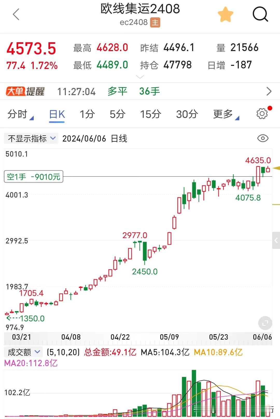 欧线是不是真下不来了?持续扛单中浮亏扩大到9000块钱,相对于昨天扩大5000块钱浮亏,相对于第一天开单回血2000块钱,昨晚为了赌一把美联储不降息预期,果断多了一手沪银,今天又手痒利用所剩无几的几千块钱玩了一把pvc,今天沪银平仓掉,欧线持续扛单,扛到它暴跌为止。我就不信它欧线不是期货吗?期货跌你不跌,期货涨你还涨,扛,扛单你拉爆我为止。