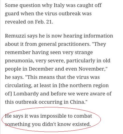 “你根本不可能去与你并不知道存在的东西搏斗。” 意大利药理学家朱塞佩·雷穆齐(Giuseppe Remuzzi),对于意大利应对新冠肺炎疫情的“措手不及”,作如是说。 为什么中医可以和“你并不知道存在的东西搏斗”? 说白了,中医治的首先是人,然后才是病;中医治“病”,还是要辨“证”;中医战“疫”有很多策略和方法,不单是打打杀杀。无论它是谁、长什么样子、有多强的破坏力,从病“象”、病“机”分析,就能见招拆招。 中医药——老祖宗留给我们的无价财富,真是国人的福气。 据说四川、浙江援意医疗队,带去援助物资主要是ICU设备,包括心电图机、呼吸机,新闻说意大利要求中国接管ICU ……。也看到援意专家组包含两名中医,也带了一些中药。中成药是连花清瘟和金花清感两种。 第二批中国援意抗疫医疗专家组组长裘云庆说:“中医中药对轻症病人,或者对预防还是有一定的作用。”武汉中医“承包”的江夏方舱医院,“无一例轻症患者转成重症”的成功的模式,意大利也是可以借鉴借鉴的。 猜测,中医药的应用,可能会有很多制约因素,大概不能像在国内一样“大有可为”。