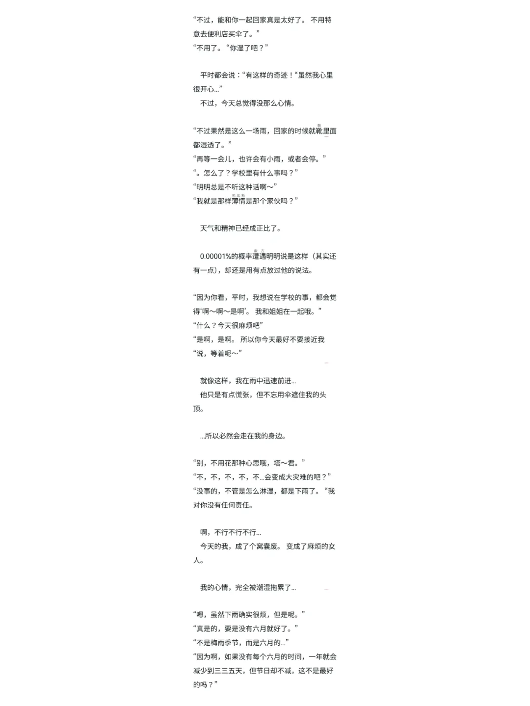 梅雨季节果然会让人心情糟糕,再回想起来之前竹马说的那个喜欢的人,心情就更糟糕了,会是自己吗?不会是自己吗?想要直接问出来却也害怕得到糟糕的答案,就算是刚好遇到了竹马一起撑伞回去也想要闹脾气,知道不对劲但是就是很难控制,但是不愧是青梅竹马,一路上慢慢说着那些事情,女主的心情也和雨一样变小转晴起来,等雨季过去了,到来的夏天应该是更加灿烂晴朗的吧?