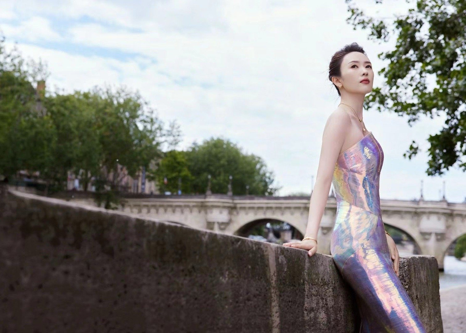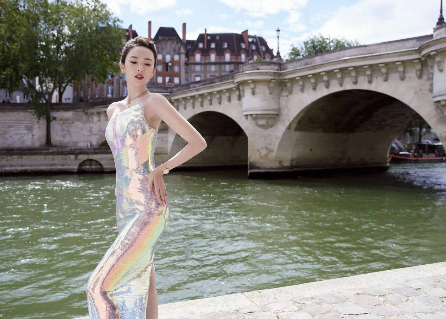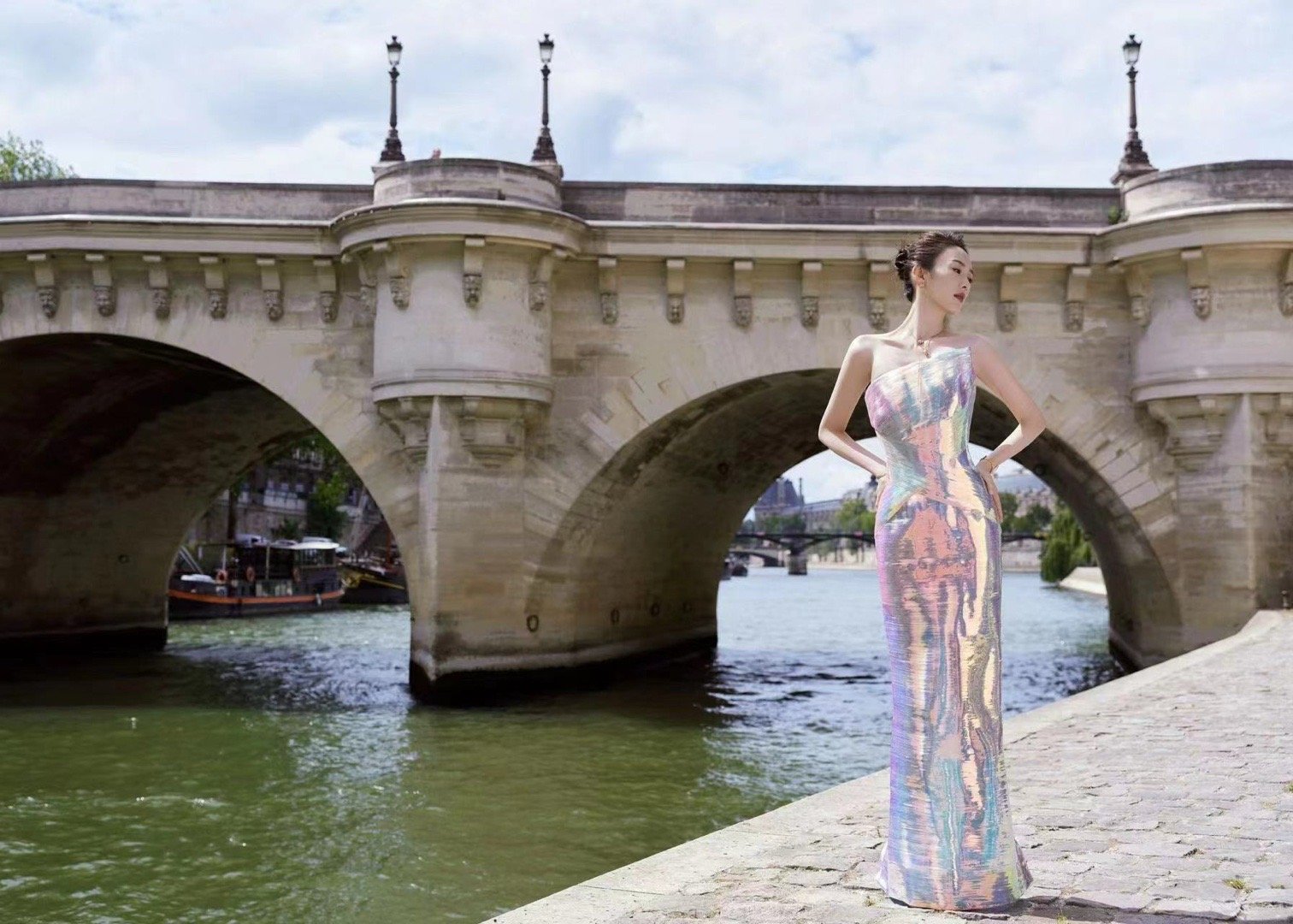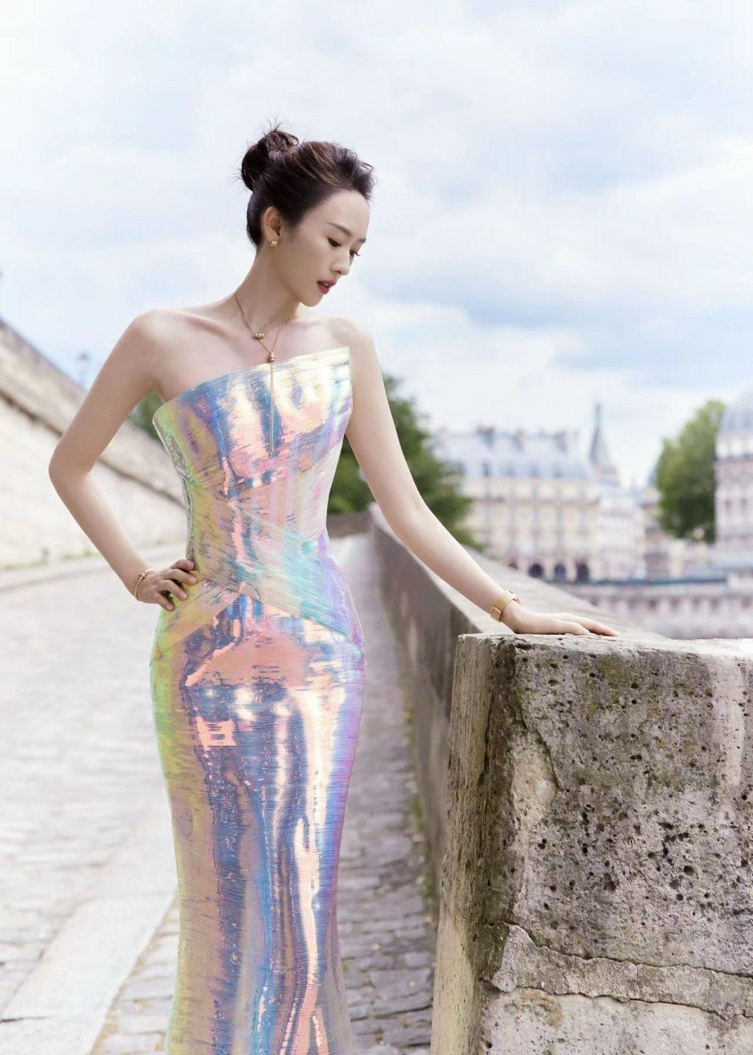 #童瑶镭射幻彩裙##童瑶发光长裙# 巴黎活动造型,一袭抹胸发光镭射长裙太美了!