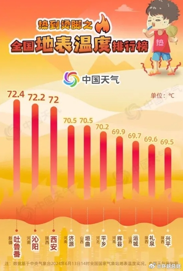 【#多地热到烫脚#!网友:最难熬的日子来了】据中国天气网消息,6月13日华北平原等地高温仍处于鼎盛状态,河北中南部、山东西北部、河南中北部可能出现成片40℃,局地有突破6月历史极值的可能。山西、陕西、河南、河北和山东等地午后地表温度可能超60℃,局地甚至可超70℃,热到“烫脚”。(中国天气网)