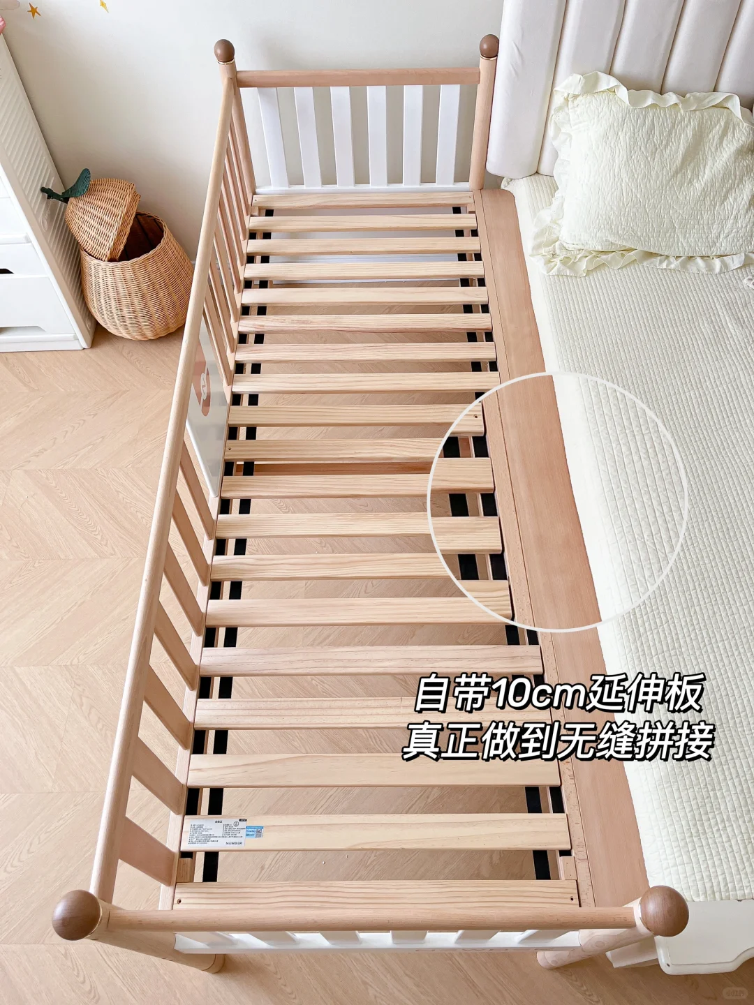 它自带10cm延伸床板,床垫也同步外延,真正跟大床0缝隙拼接,不像市面上的拼接床还要塞缝隙棉,宝宝随意翻滚都不会硌