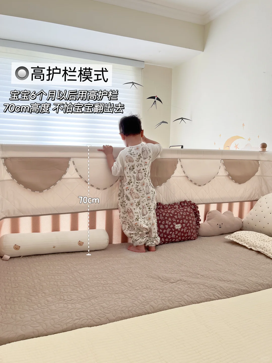👶🏻6个月以上:宝宝会坐以后用高护栏,床护栏70cm高度防攀爬,还有加厚的防撞床围,不怕磕碰也不用担心宝宝掉床翻出去