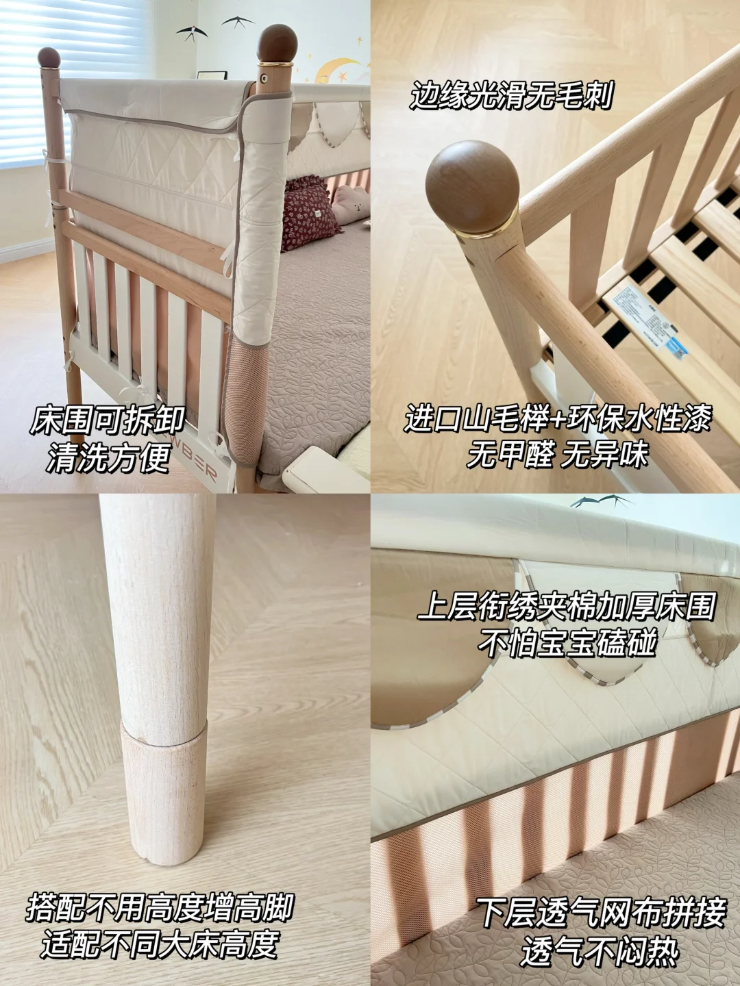 德国进口山毛榉全实木材质,无甲醛,安全环保,给宝宝用的安心,整张床边缘都很光滑无毛刺,不怕刮伤宝宝