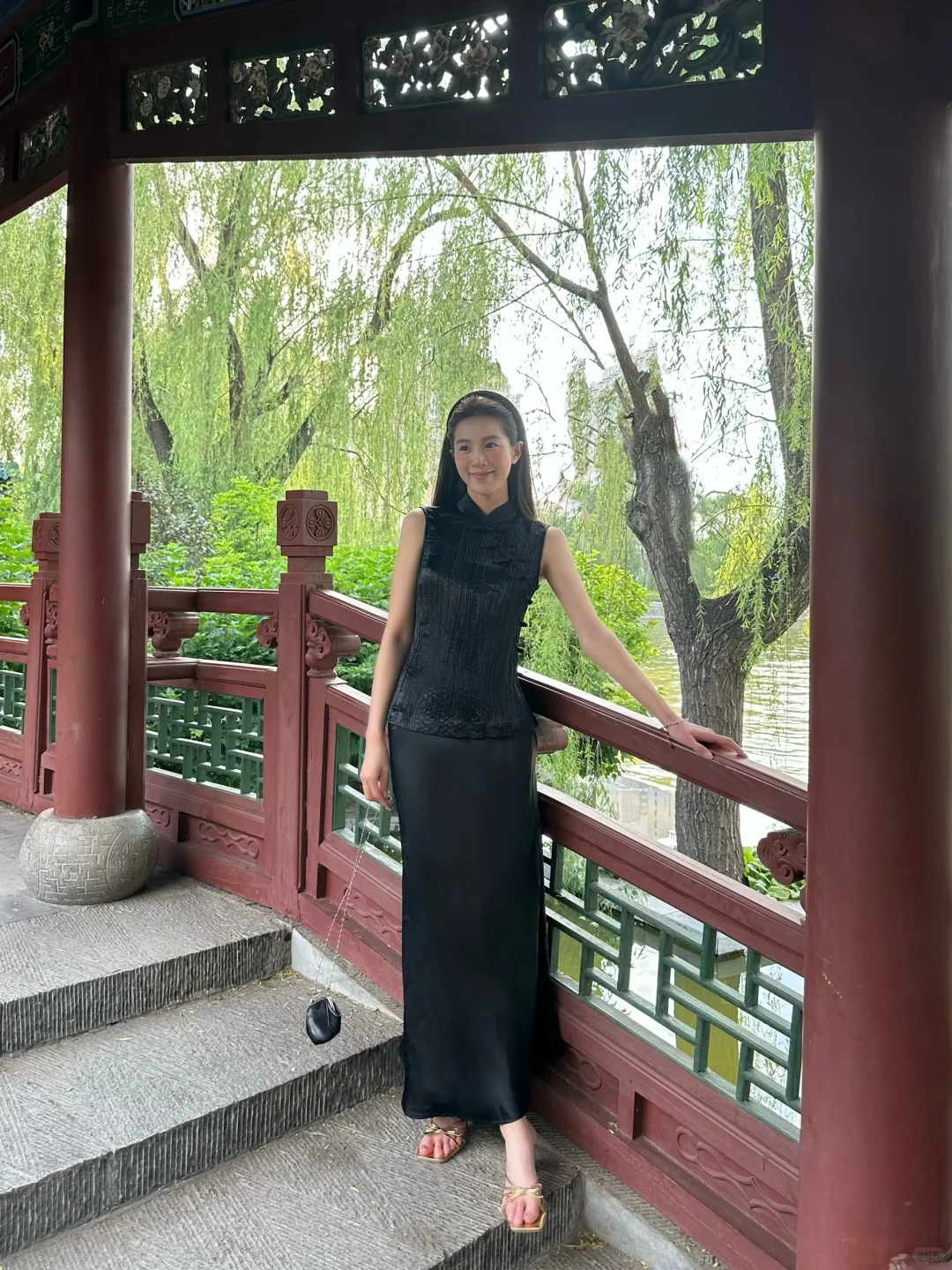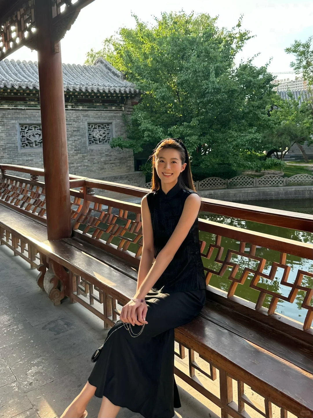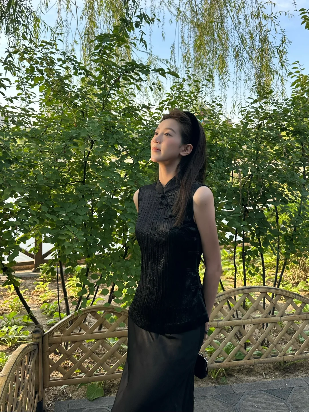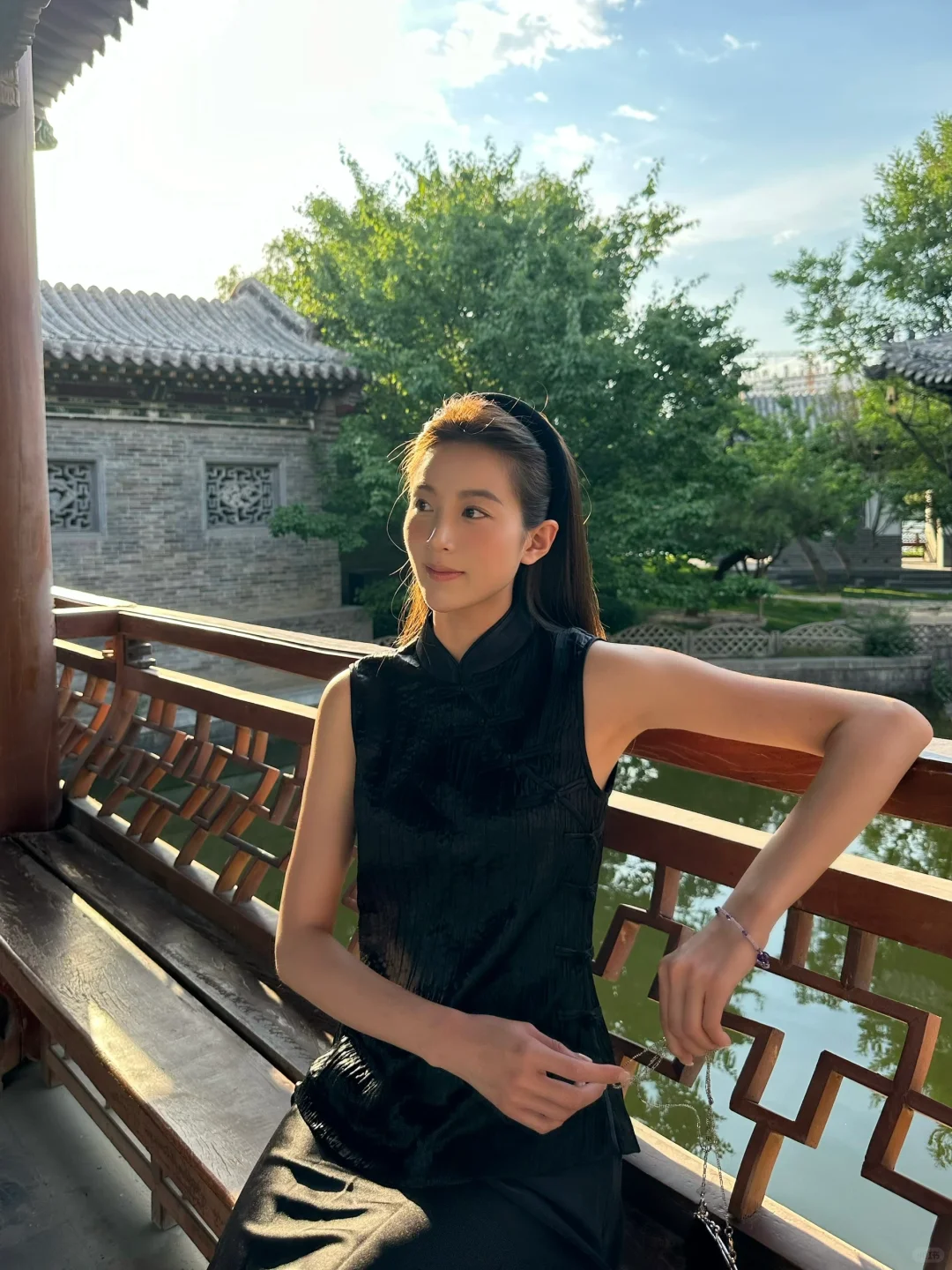 优雅东方韵,浅蓝上衣配米色长裤,漫步古风庭院,尽显时尚与古典的完美融合。