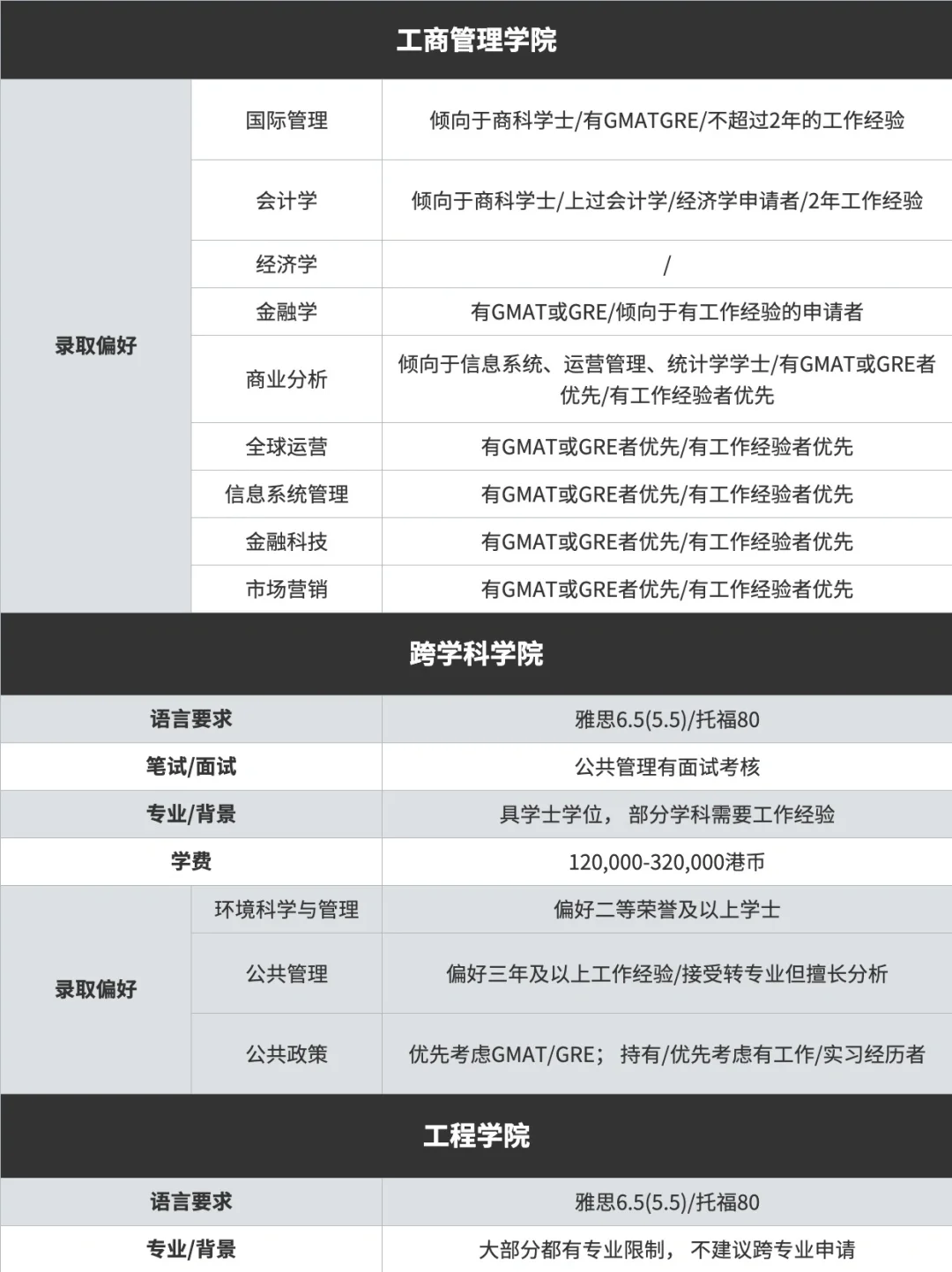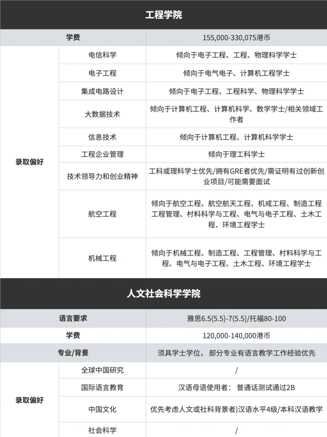 📌图中为大家展示了香港科技大学的部分申请要求、学费、录取偏好及奖学金等信息,由于篇幅有限,详细内容未能全部呈现。若想深入了解各专业的详细要求,可进行询问。所涉及的学院包括理学院、工商管理学院、跨学科学院、工程学院、人文社会科学学院。