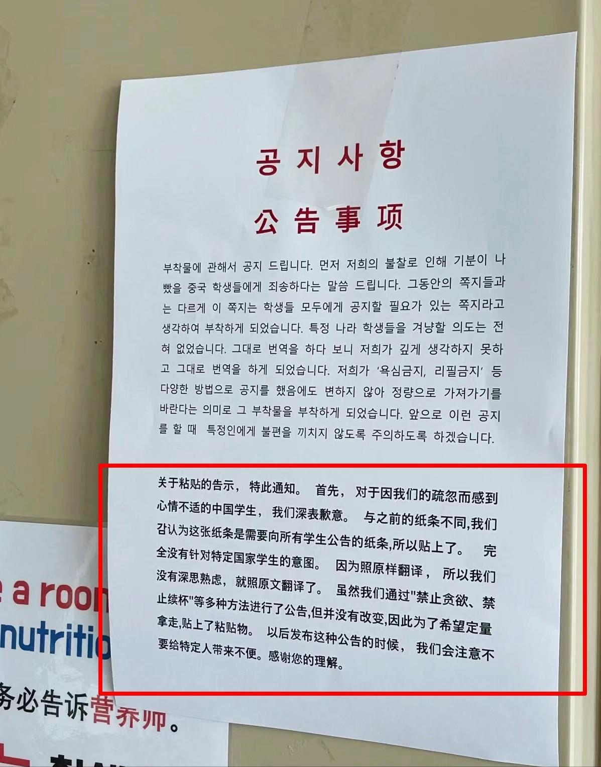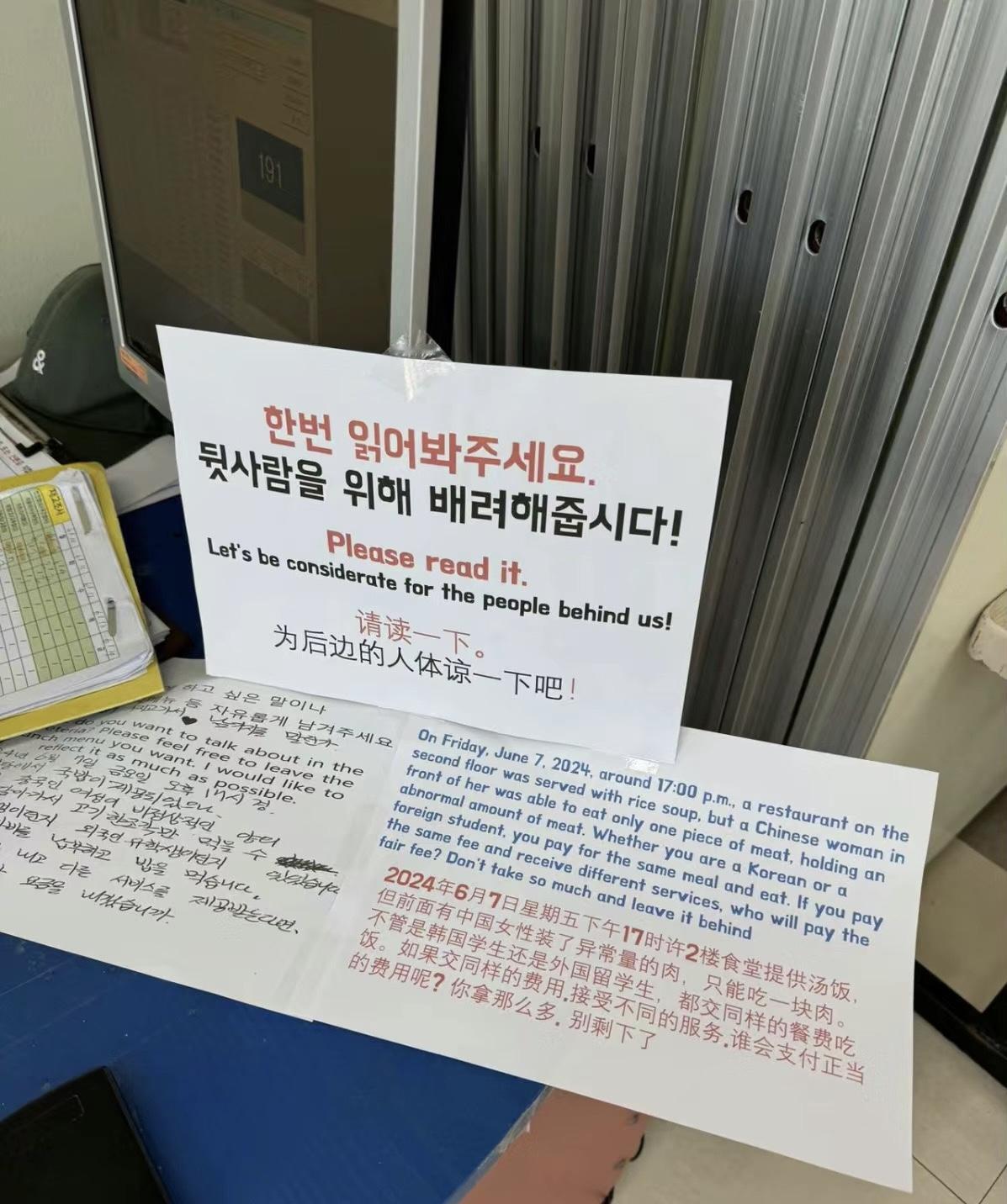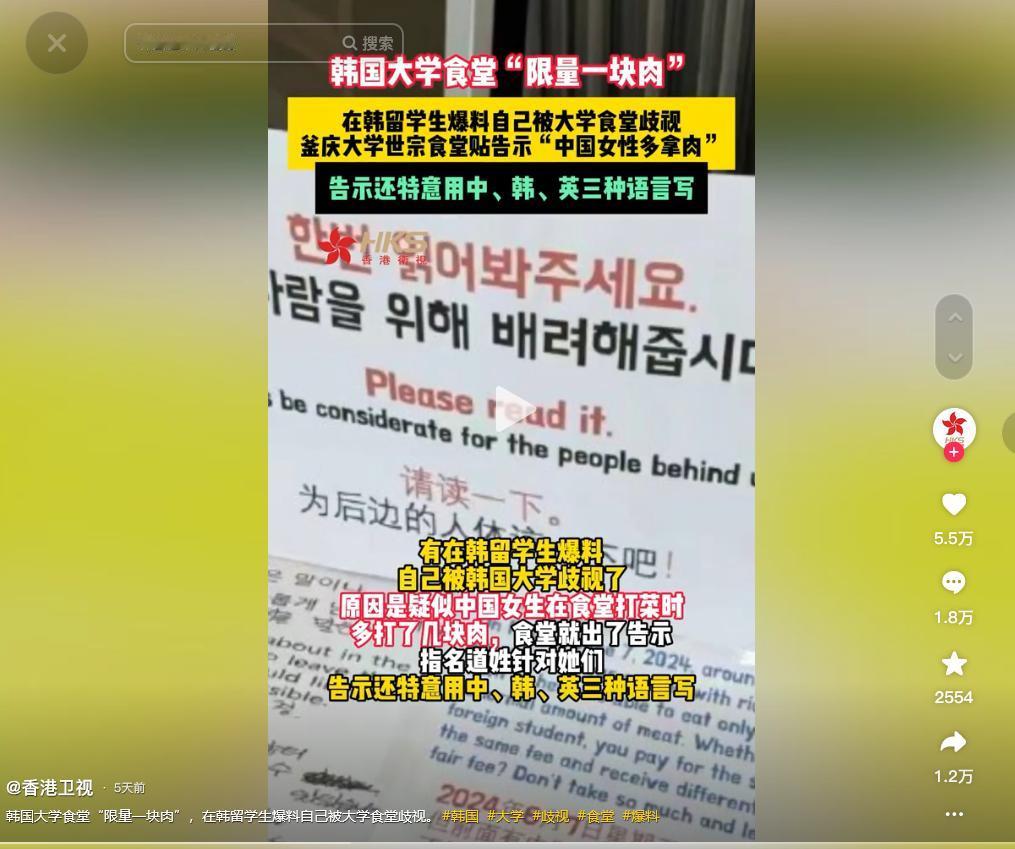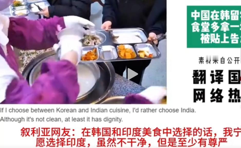 “真是炸裂!一人一片肉...”一位在韩国留学的中国人,因为盛饭时多夹了两片肉片,竟被学校以三种语言贴出告示,命令禁止铺张浪费行为,并且话里话外指责女生不为他人着想,自私自利! 【来源:香港卫视《韩国大学食堂“限量一块肉”在韩留学生爆料自己被大学食堂歧视了》】 最近,有一名韩国釜庆大学的中国女留学生在社交平台上分享了一则令人惊讶的视频。 这名女学生在视频中表示,她在学校食堂遭到了莫名其妙的通报,原因是她取的肉份量被认为“异常”。此事件迅速引起了网友们的关注与热议。 据了解,该名女生在6月7日下午于二楼食堂取餐时,监控视频拍摄到她取了“异常多”的肉。 这一情况被学校在事件通报中明确提到,并在文中特别强调了她作为中国人的身份。 通报结尾处,学校以一种讥讽的口吻“温馨提示”她:“取了这么多肉,别忘了吃完哦。” 对此,当事女生也在社交平台上公布了当时自己取得的食物照片,其中包括一些油炸食品和一碗带有一些薄片的汤。 很多网友们看过这些照片后纷纷表示不解,认为她取得肉的份量并无任何不当之处。 经过进一步了解,才发现该大学的食堂有项特殊规定:每位学生只可领取一份肉。 因为这个食堂的计划是依据每日就餐的学生人数来进行的,如果有学生领取了超过规定数量的肉,那么后来的学生可能就吃不上了。 在国内网络论坛上,对于这件因几片肉引起的事情,很多网友们纷纷表示难以置信。 有人嘲讽说,“异常量”这个词可以用于形容的居然是几片肉;也有人拿其他餐厅比较,认为即便是35元人民币的普通面条也比学校提供的肉类多得多。 同时也有网友表示疑惑,食堂的食物供给难道已经短缺到这种地步了吗? 与此同时,国外网站上的韩国网友们也在讨论这起事件。 一些韩国人对这起事件提出了解释,他们认为学校的食物本来就很丰富,但由于中国留学生取餐时过于贪心,以至于影响了后来同学的食物供应。 另有一些韩国人则表达了对中国留学生狼吞虎咽、一次性吃坏肚子的担忧。 这个观点马上招来了中国网友们的反击。 甚至有激进的声音提到,应该考虑停止向韩国出口白菜,这样一来,韩国人就连泡菜都可能吃不上了。 此外,有一位叙利亚网友也加入了战斗。 他在社交网络上明确表示,如果真的要在韩国和印度美食中做出选择,他宁愿选择后者——尽管不干净,却能保证人的尊严。 面对不断升级的争议,釜庆大学最终发表了道歉声明,并表示之前的公告本意是为了提醒大家不要贪心,珍惜资源,今后会注意更恰当的表达方式。#社会#