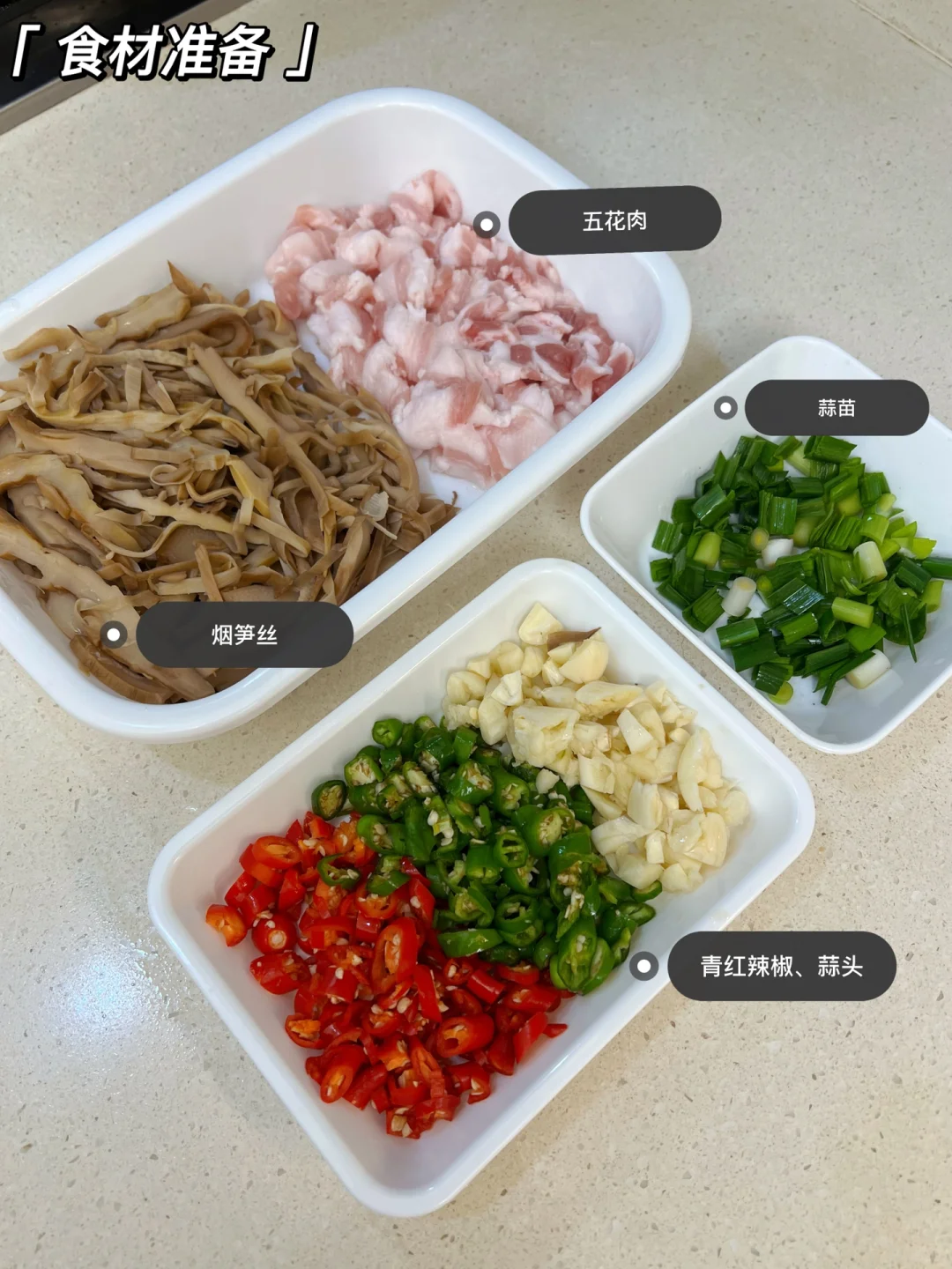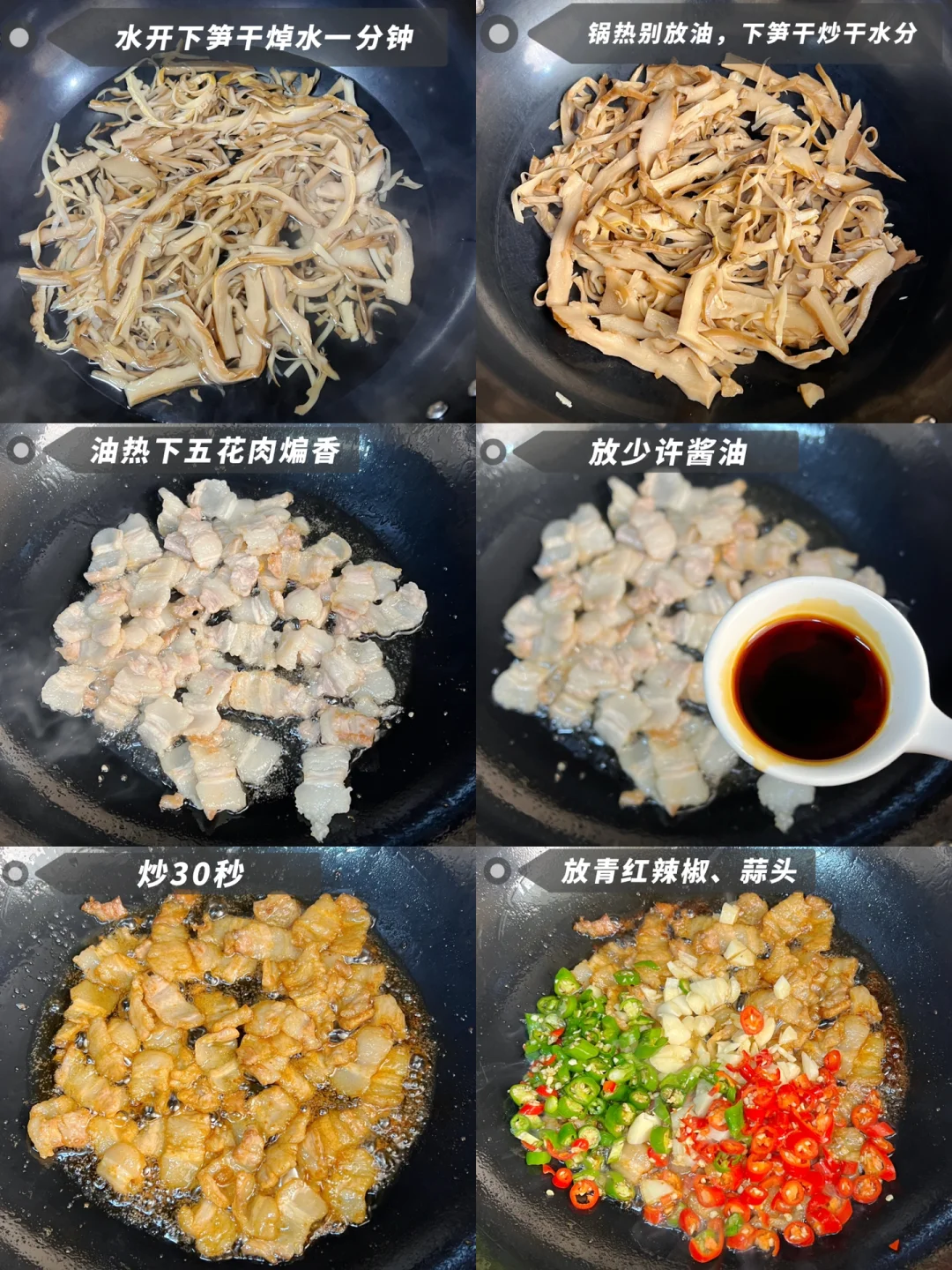在江西老家真的超多竹笋,太想念冬笋的味道了,在这边买不到新鲜的冬笋,但有一盒一盒的烟笋尖,拿来炒五花肉也是绝了,做法简单,炫了两碗米饭[大笑R][大笑R] 🍀食材:烟笋丝、五花肉、青红辣椒、蒜头、蒜苗; 👇做法: 1⃣️水开下烟笋焯下水,盛出滤干水分,锅热不放油,下烟笋炒干下水分,盛出备用; 2⃣️油热下五花肉煸香,放少许酱油炒30秒,下青红辣椒、蒜头、少许盐炒出香味; 3⃣️下笋丝炒匀,放适量老油、食盐、蚝油炒一分钟,再放少许鸡精、蒜苗炒匀即可;