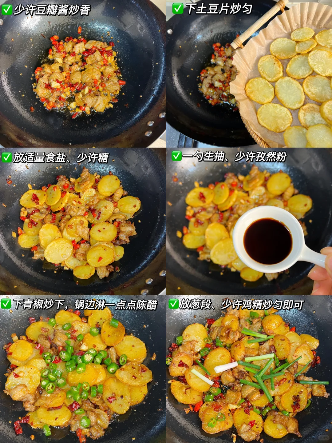 3、留少许底油,下五花肉炒香,推至一边,下蒜头、红辣椒、干辣椒炒香,再放少许豆瓣酱炒出香味,倒入土豆炒匀,放适量食盐、白糖、一勺生抽、少许孜然粉炒匀,下青椒、锅边淋一点点陈醋炒匀,再放少许鸡精、葱段炒匀即可;