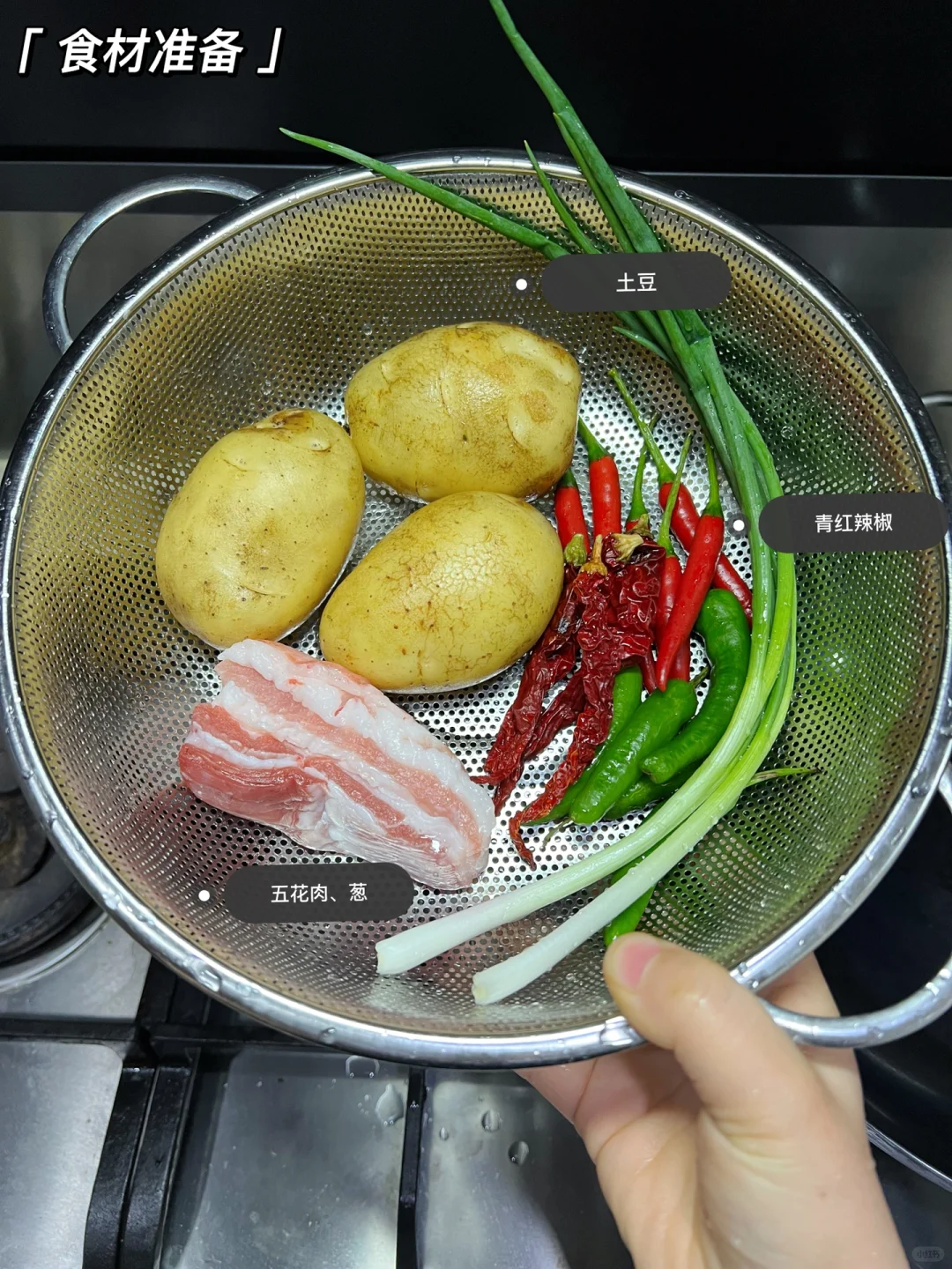 🍀食材:土豆、五花肉、青红辣椒、干辣椒、蒜头、葱、洋葱;