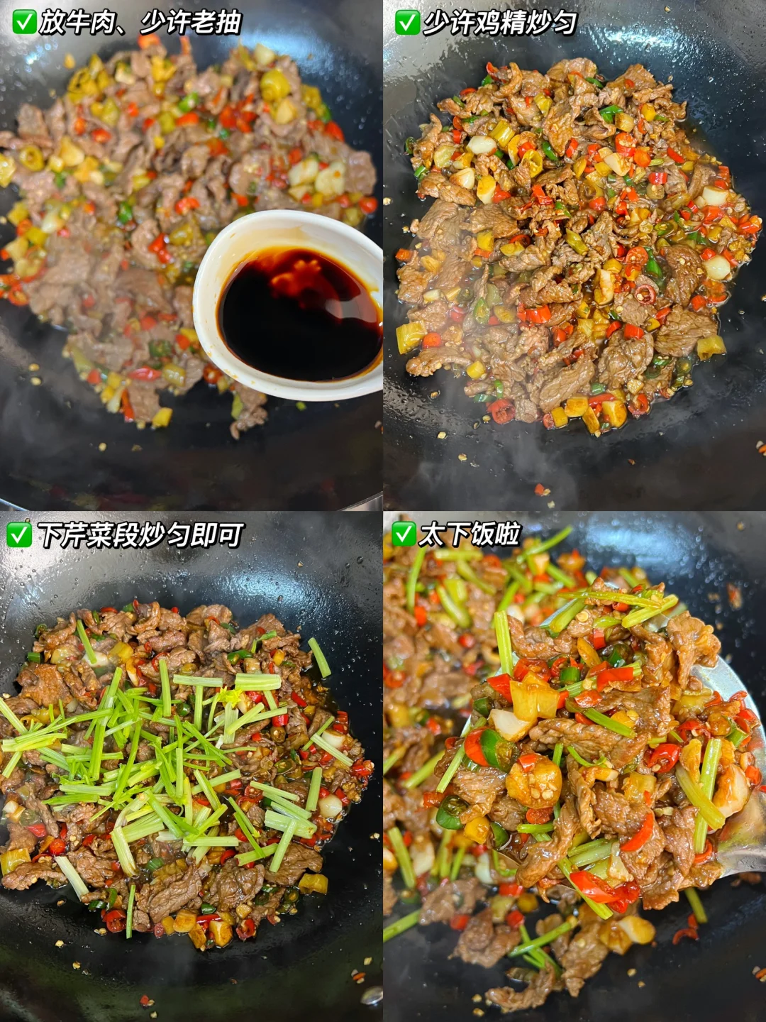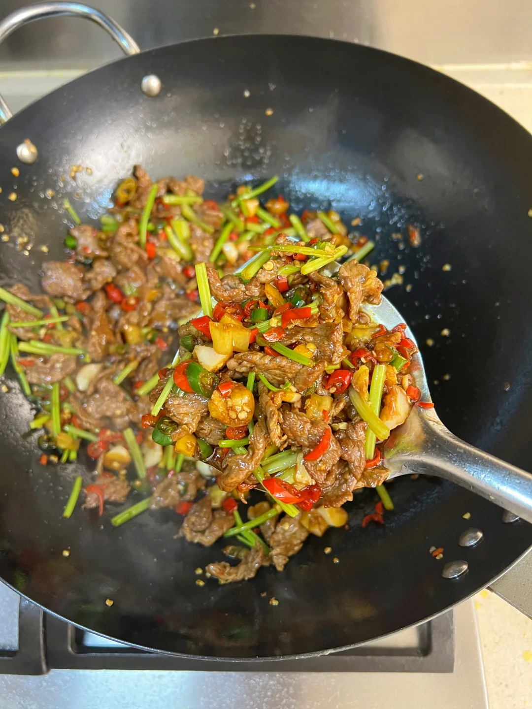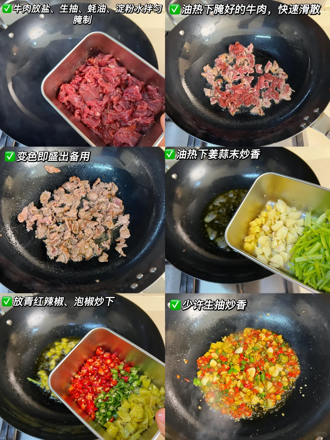 今天看到有新鲜的黄牛肉卖,那不得安排个小炒黄牛肉,按这个做法,和店里味道差不多,每次朋友来我家吃饭都会点这个菜,真的巨好吃呀~ 🍀食材:黄牛肉、青红辣椒、泡菜、姜蒜、芹菜; 👇做法: 1⃣️牛肉切小块,放盐、生抽、蚝油、淀粉水拌匀,再放少许食用油拌匀腌制10分钟; 2⃣️油热放牛肉炒变色,盛出备用,另起锅,油热下姜蒜炒香,再放青红辣椒、泡椒、少许生抽炒香,倒入炒好的牛肉炒匀,放少许老抽、鸡精、芹菜段炒15秒即可;