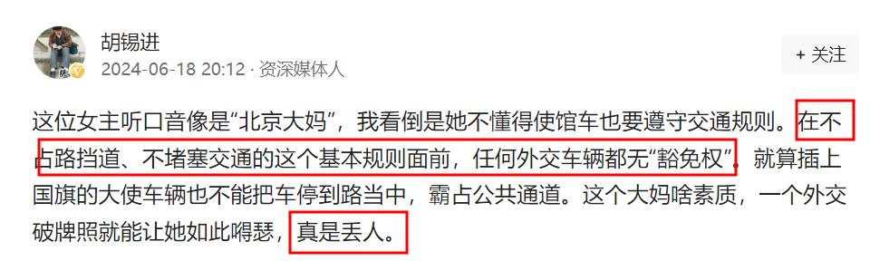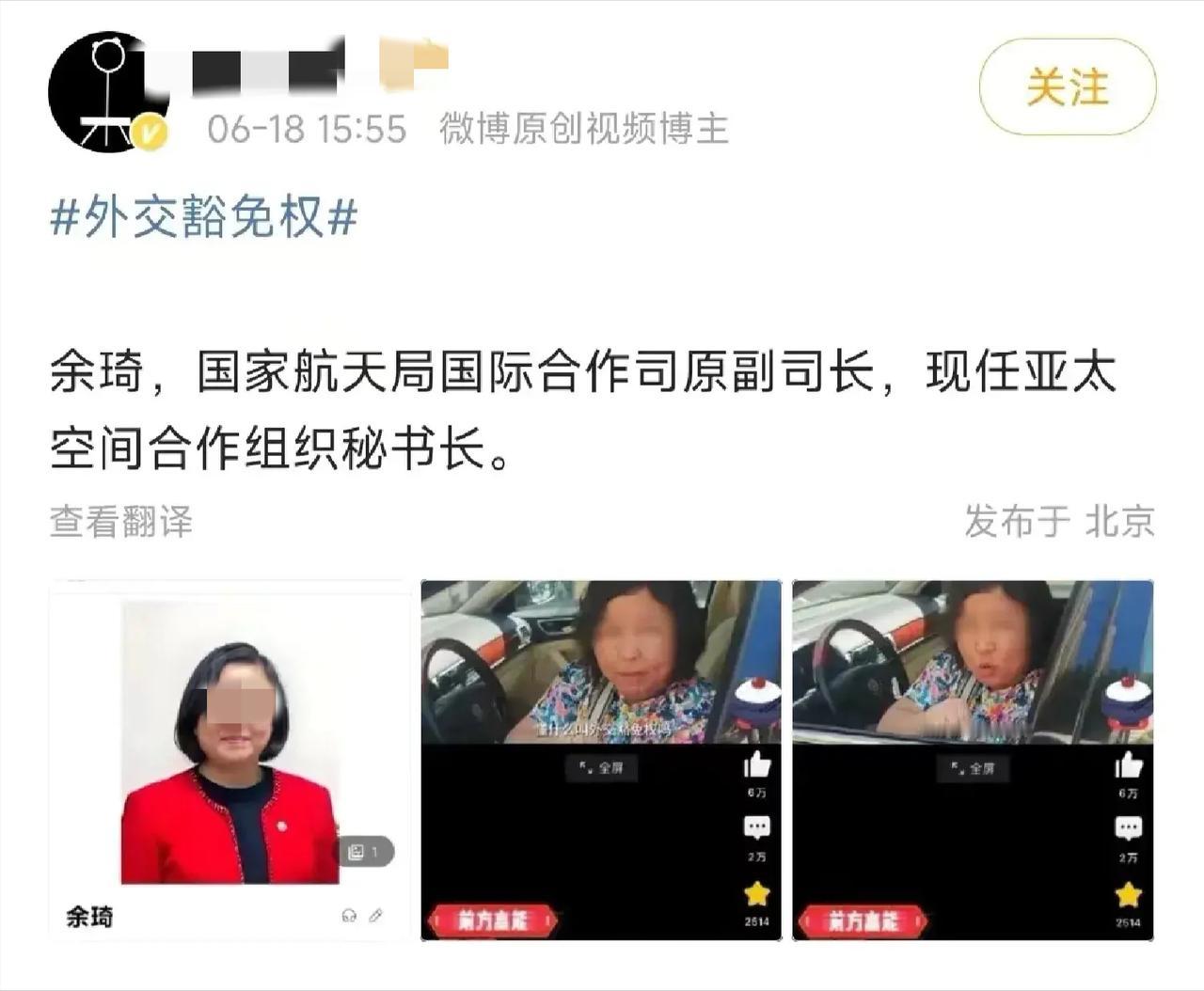 “网友:严查这个女人,德不配位!”使馆车违停后续:大妈身份被扒,北京警方评论区沦陷,胡锡进怒斥 【来源:香港卫视;胡锡进微博】 近日,关于北京一位大妈乘坐使馆车辆违规停车一事在网络上引起了巨大反响。 据了解,这次争执发生于6月16日,北京市民吉先生目睹了一幕影响交通的事件——一辆使馆车辆停在道路中央导致后方车辆通行困难。 在这一过程中,吉先生主动出面要求该车司机正确停车,但却引发了双方的辩论和冲突,由此拉开了这起备受关注的序幕。 事发时,使馆车辆的司机拒不下车与吉先生面对面对话,只是不断声称自己有权这么做。 在此期间,坐在车中的一名身份神秘的大妈嘲讽吉先生缺乏行车知识并对他的驾驶技术予以质疑。 而当吉先生试图联系相关单位寻求帮助解决问题的时候,大妈却在一旁嘲讽并挑衅道"要不要我给你支付学费,学学习?" 随后在司机携一只宠物狗先行离开之后,大妈更是直接坐进了驾驶座,准备亲自操作,这一幕让在场的吉先生和他的夫人感到相当的不舒服。 事态进一步恶化是由于吉先生的妻子将这一过程录像取证,却被这位大妈发现并强烈抗议,甚至出言侮辱。 大妈认为自己的权利受到了冒犯,并开始威胁吉先生的妻子,称她将立即报警。 然而,在报警之后,她却开始对吉先生一家进行拍摄和挑衅,这种双重标准的行为立刻激起了公众的义愤。 最令人不可接受的时刻出现在大妈宣称拥有"外交豁免权",这句话成为了整个事件中最具争议的焦点。 在公众眼中,这无异于一种对法律权威的蔑视和对普通公民权益的侵犯。 一时间,网络上掀起了轩然大波,许多人表达了对这种滥用特权的强烈不满,并要求有关部门对此展开彻查,给公众一个合理的解释。 随着事件的不断升级,越来越多的声音开始呼吁有关机构介入此事。 网友们纷纷涌入官方社交媒体平台要求了解事件的处理情况。 然而,就在此时,最早报道了此事的一家媒体悄然删除了其发布的视频。尽管外界并不清楚具体原因,此举无疑加剧了公众对于信息透明的担忧。 舆论的压力同样吸引了知名媒体人和公共评论者胡锡进的注意。 他表示,无论在何种情况下,交通法规都是最基本的行为准则,不应有任何特权存在。他批评涉事的大妈素质低下,其举止不当有损自身形象。 与此同时,网络的力量再次发挥了作用。 许多网友通过分析车牌号和大妈的外貌特征,成功推测出该大妈的真实身份。 原来是一位曾在多个国家航天局担任要职的前官员。如此显赫的背景,加上她在公共场合所展现出的行为,形成了鲜明的对比,令人感叹。 随着事件的持续发酵,更多细节被发掘出来。 据一些网友提供的信息,这位涉事的大妈疑似是亚太空间合作组织的秘书长余琦,有着不凡的社会地位和历史成就。 尽管她曾有过辉煌的社会贡献和履历,但在此次事件中,她的表现显然没有得到公众的理解与支持。 目前,该事件的真相和结果依旧处于扑朔迷离之中,公众期待着能有一个更加公正与透明的结果出现。#社会##人物#