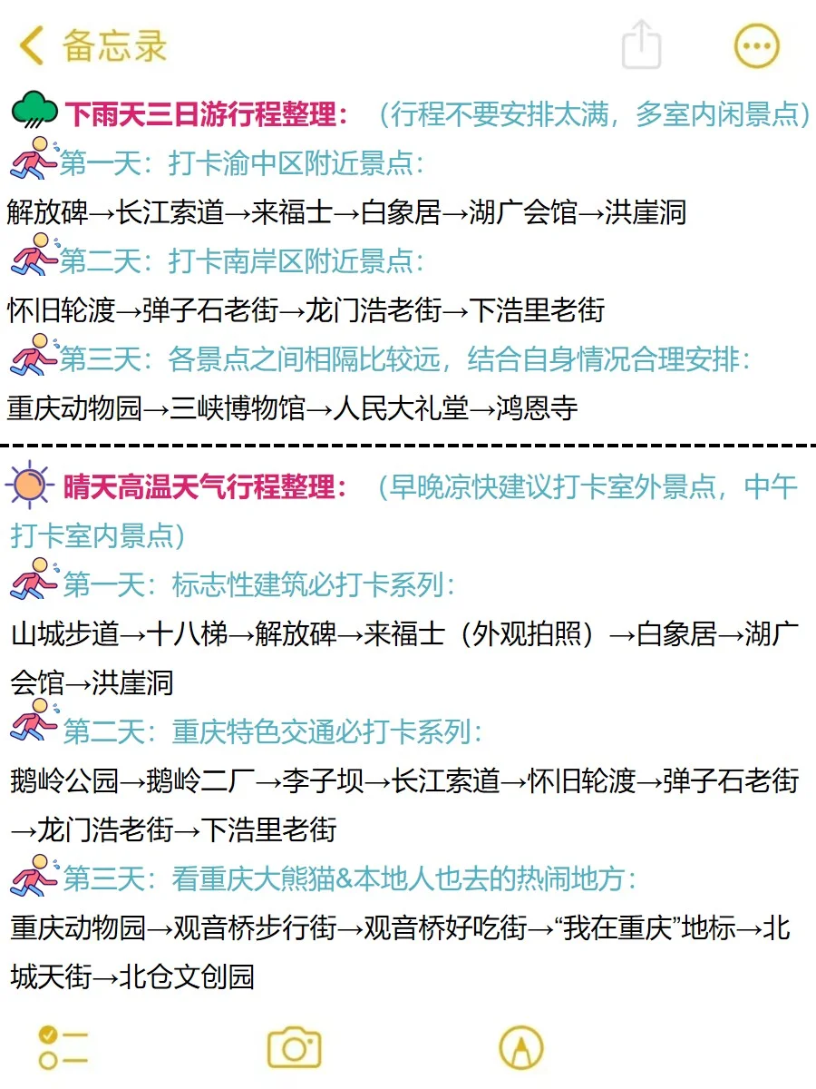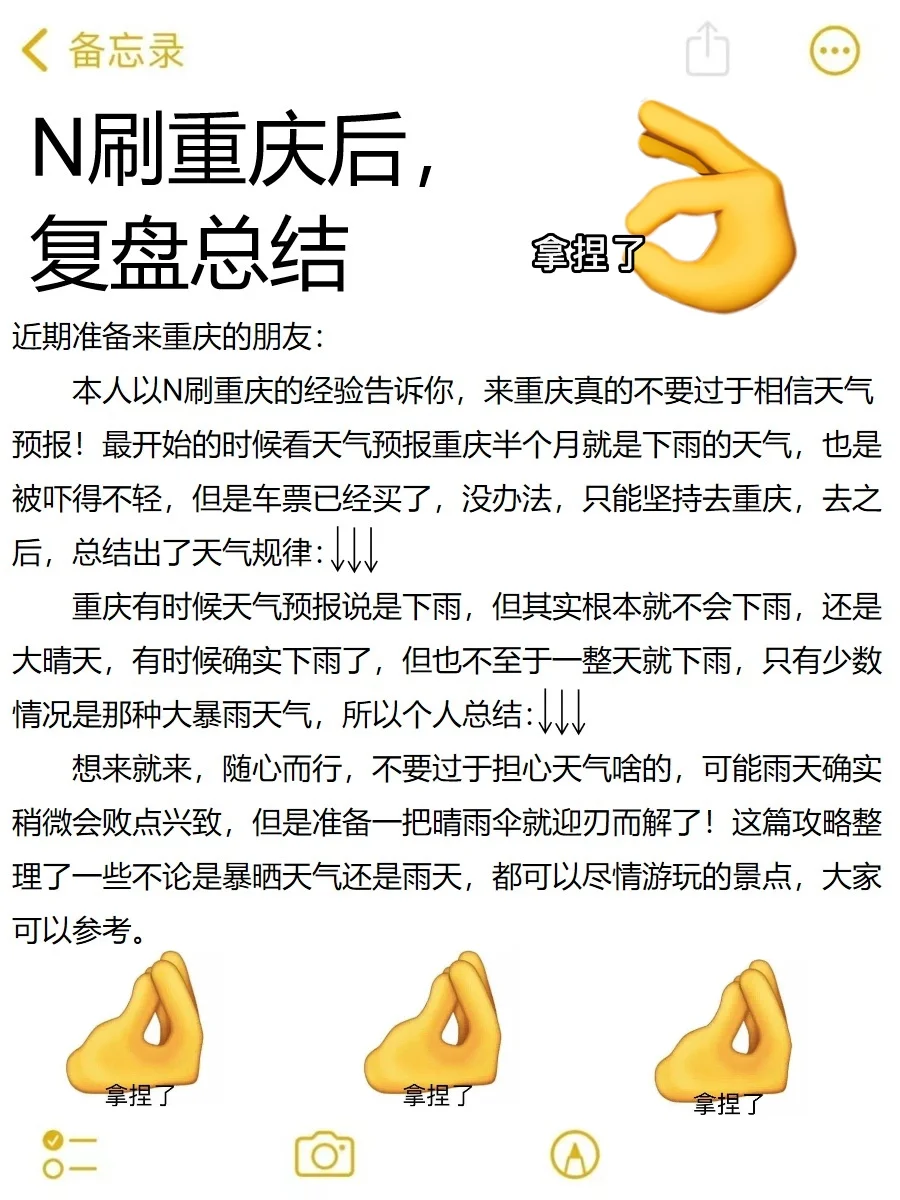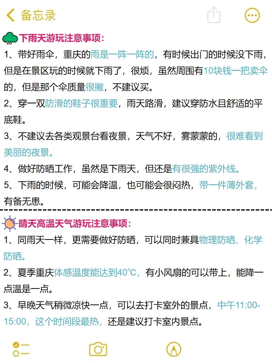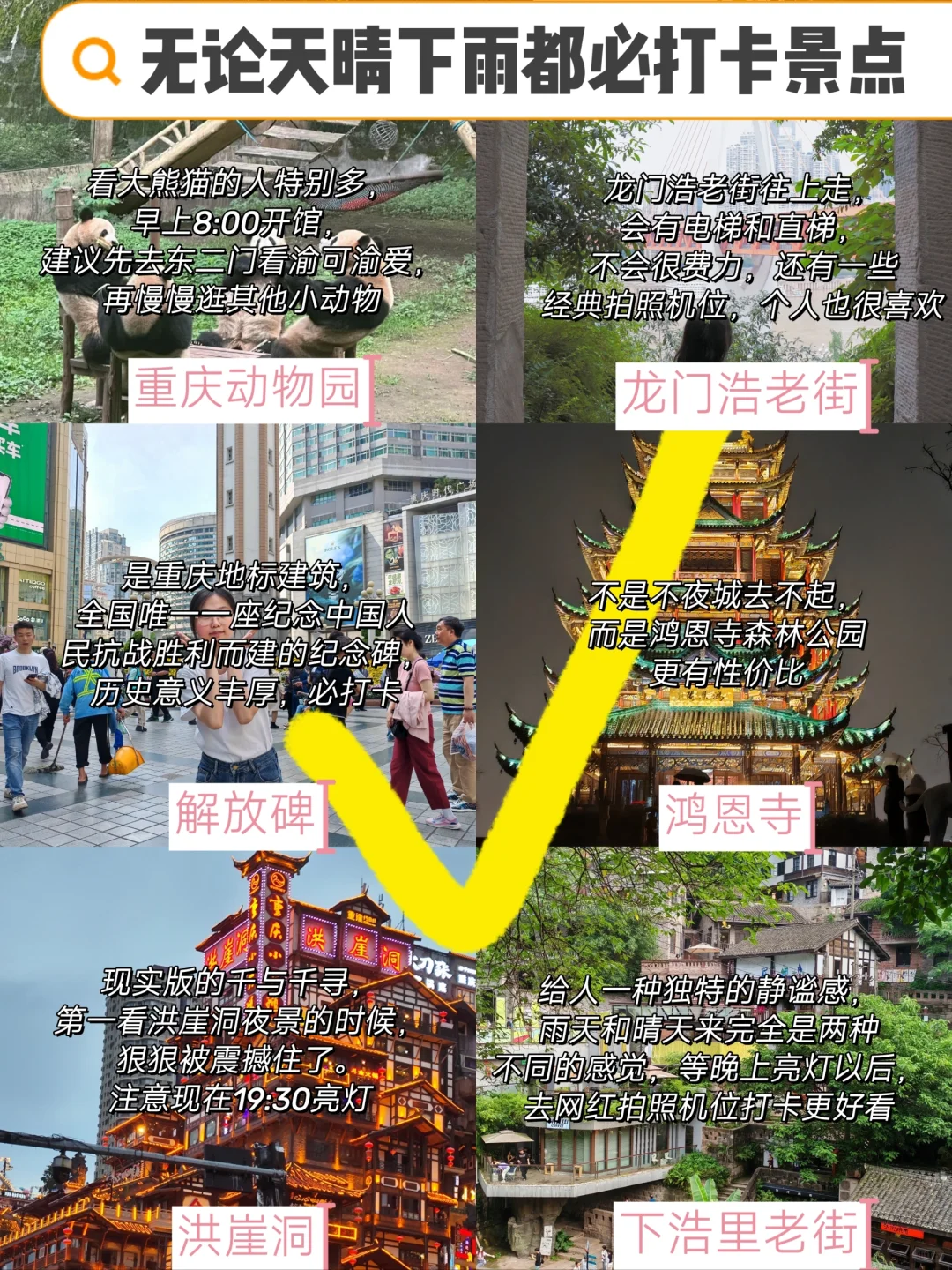 重庆的天气真是说变就变,上一秒还晴空万里,下一秒就乌云密布,本来做好的攻略又不得不临时改行程,体验版真的很糟糕😓,这里以我的经验,整理了分别适用于晴天、雨天的重庆游玩攻略,需要的姐妹自取: