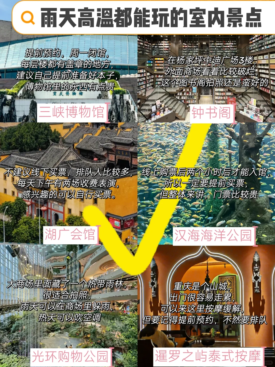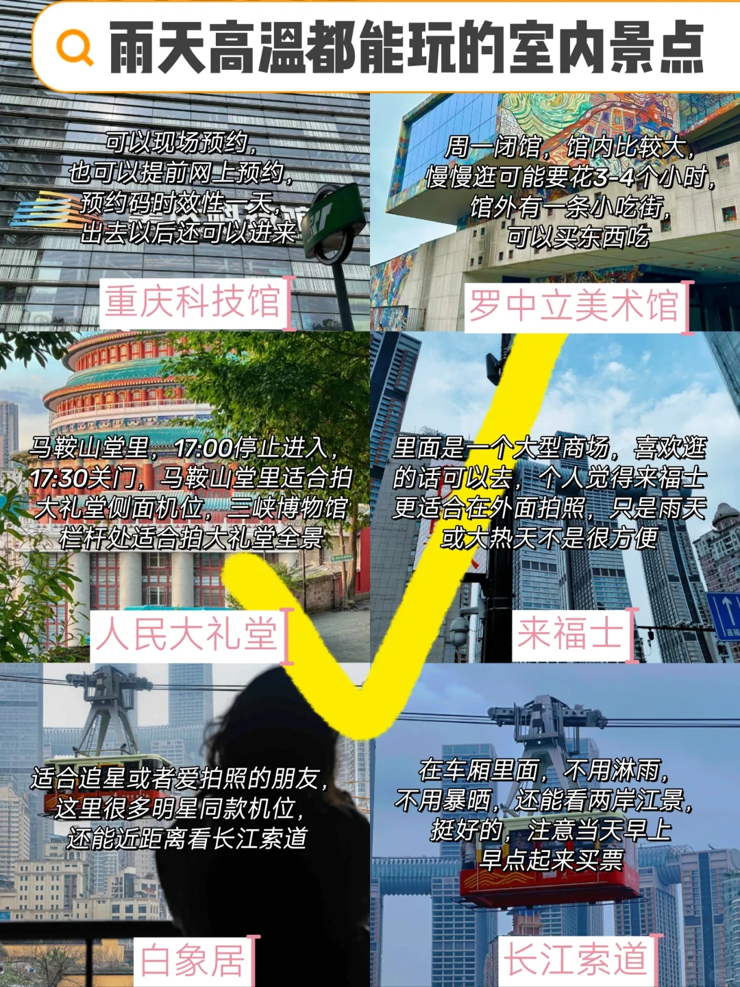 重庆科技馆、罗中立美术馆、人民大礼堂、来福士、白象居、长江索道、三峡博物馆、钟书阁、湖广会馆、汉海海洋公园、光环购物公园