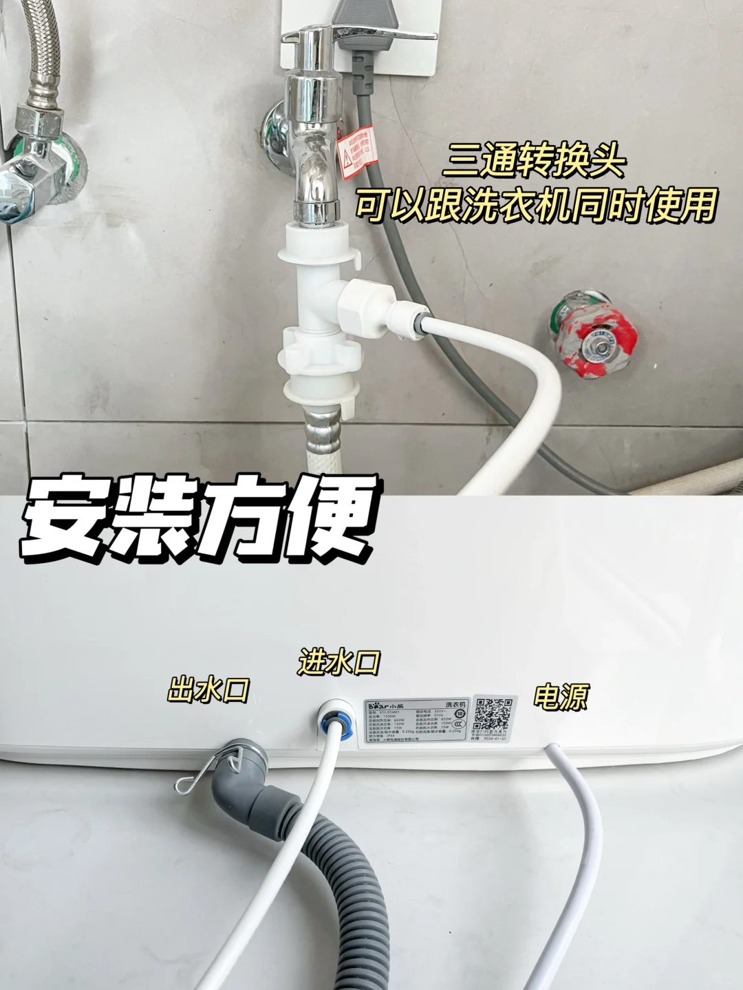 最后就是安装也方便,自带的三通转换头,可以连接到家里的大洗衣机上,就很方便,不用额外接水管,直接放在阳台的大洗衣机上就ok了,自动进水、排水,敲方便!